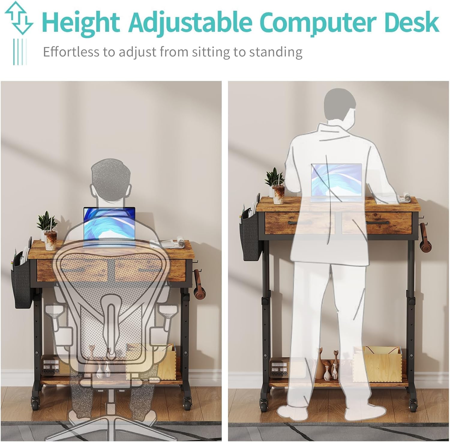 Small Portable Standing Rolling Desk - 32 Inch Adjustable Mobile Stand Up Teacher Desks with 2 Fabric Drawers on Wheels, Couch Sofa Side Laptop Table with Storage for Bedroom Home Office, Rustic Brown