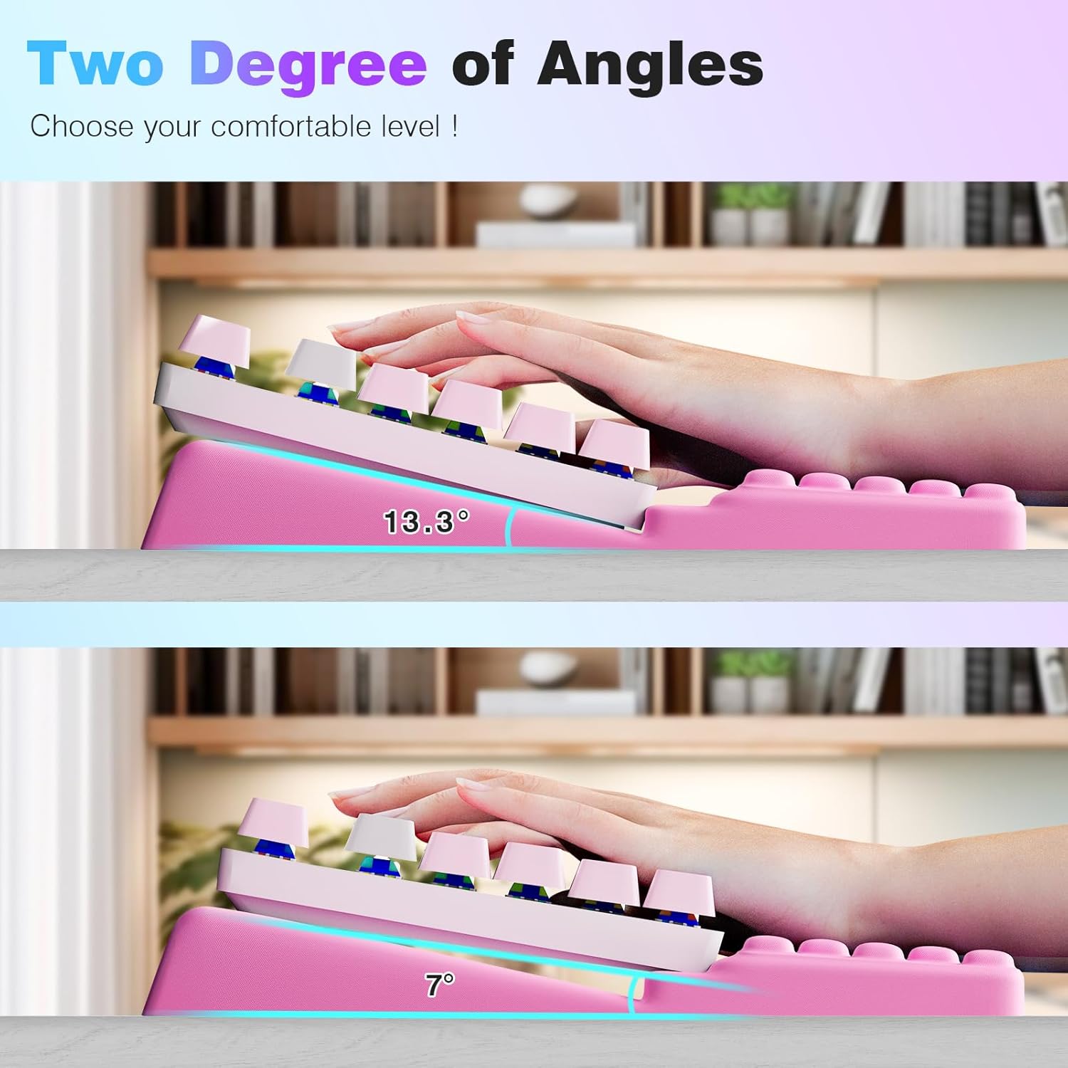- Works with most keyboards and features two angle settings - adjust the tilt to match how you type for all-day comfort.