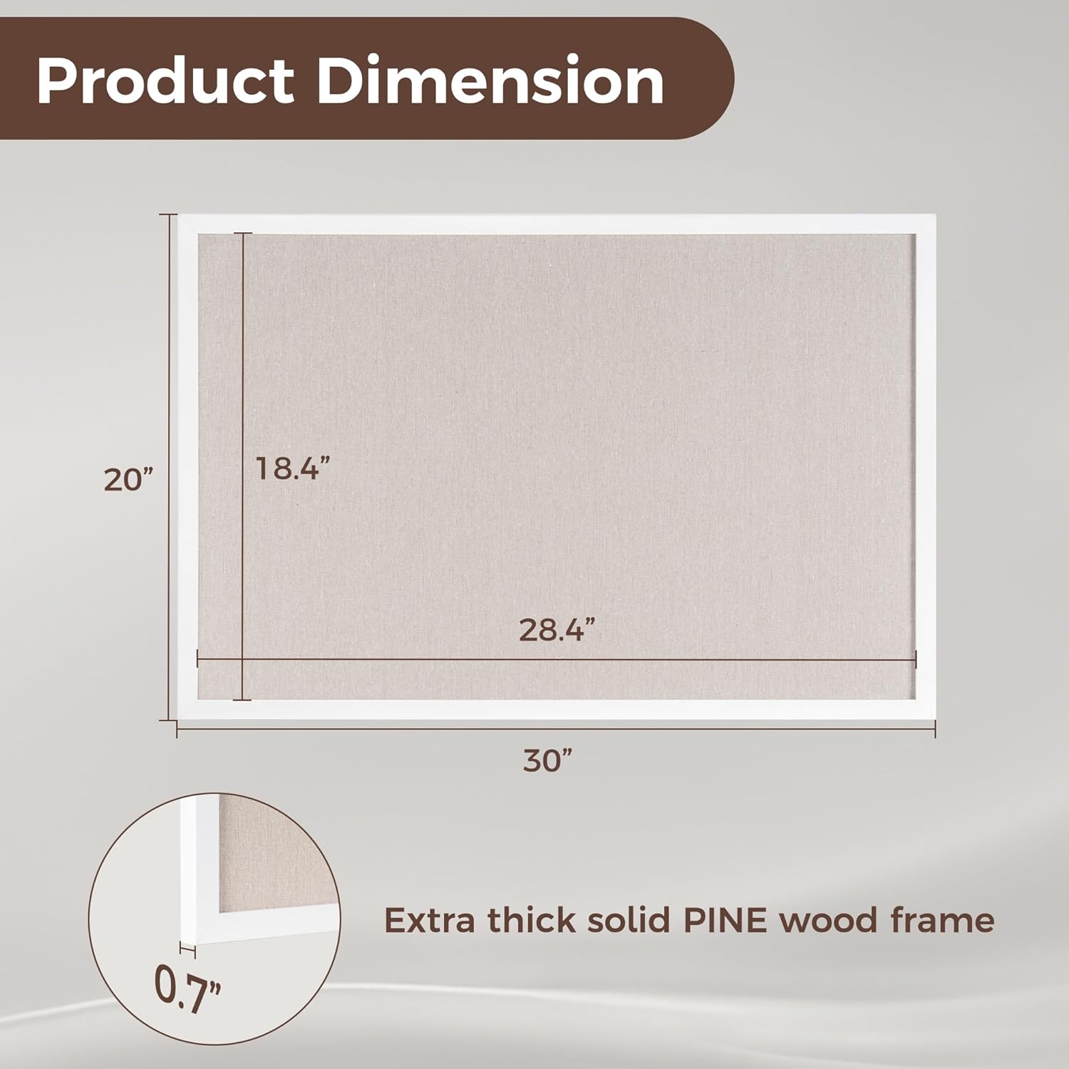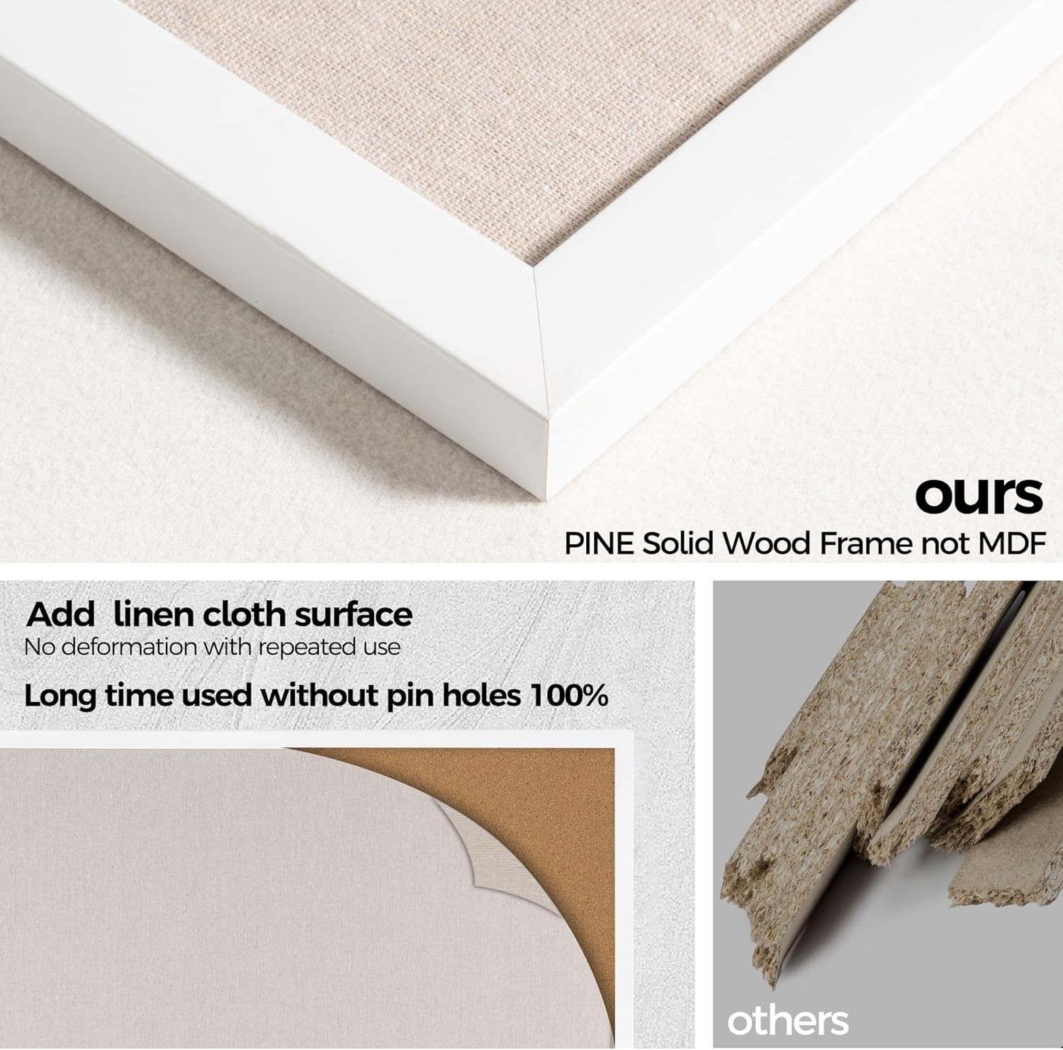 - Pine Frame Material: Our cork boards for walls is made of 100% pine wood which has well self-healing ability and repairability. The pin board features a four-ply splint design that is strong and thick enough not to be punctured by thumbtacks.