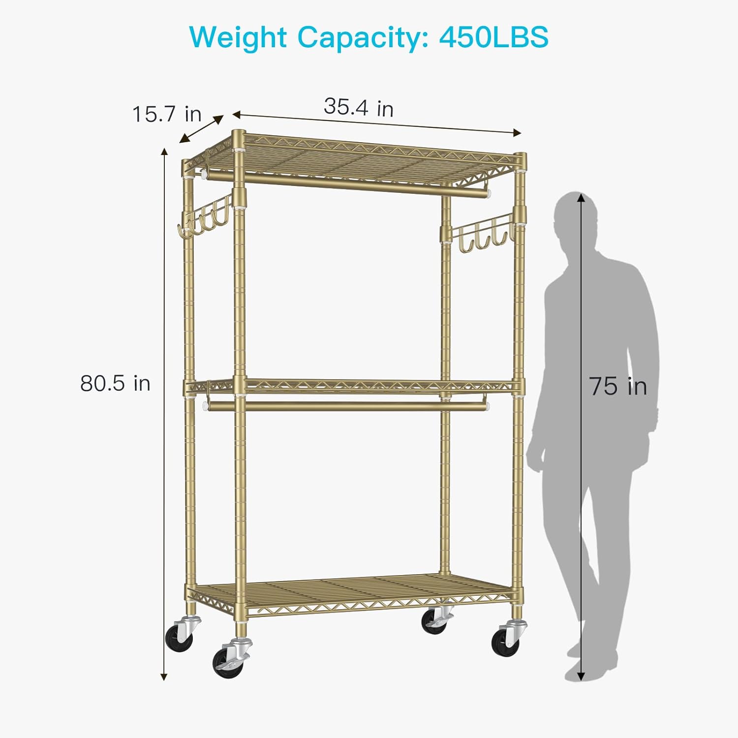 P1 Rolling Clothes Rack, Movable Metal Garment Closet Organizer with Lockable Wheels, Clothing Wardrobe with Double Hanger Rods and Hooks, 35.4" W x 15.7" D x 80.5" H, Load 450lbs, Gold