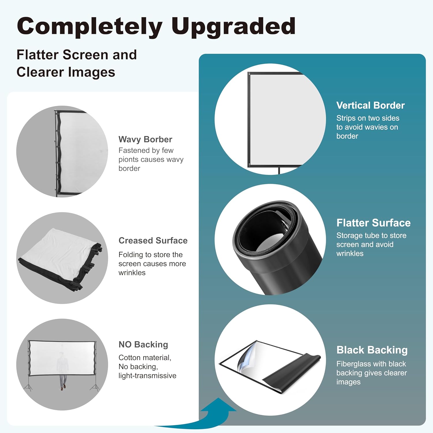- PROJECTOR SCREEN WITH HIGH FLATNESS: You will receive a completely upgraded large size projector screen with high flatness, this projector screen 150 inch uses high gain fiberglass to project clear images, the thicker fabric makes its surface more flat and wrinkle-free, with a black backing that won't be translucent, we add strips on two sides of the screen to make it more vertical, and we use a storage tube to protect and store the screen to avoid creases on its surface.
