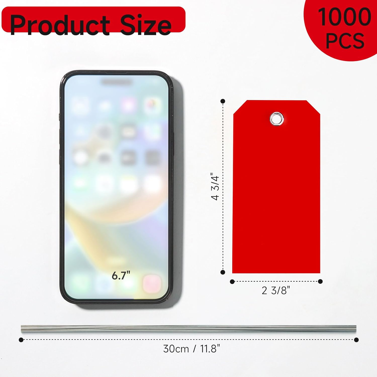 1000 Pieces Plastic Shipping Tags with Wire Labeling Tags Waterproof Hang Tags with Reinforcement Hole Writable Luggage tag Loops for Equipment Inventory Parts Garage (Red, 4 3/4" x 2 3/8")