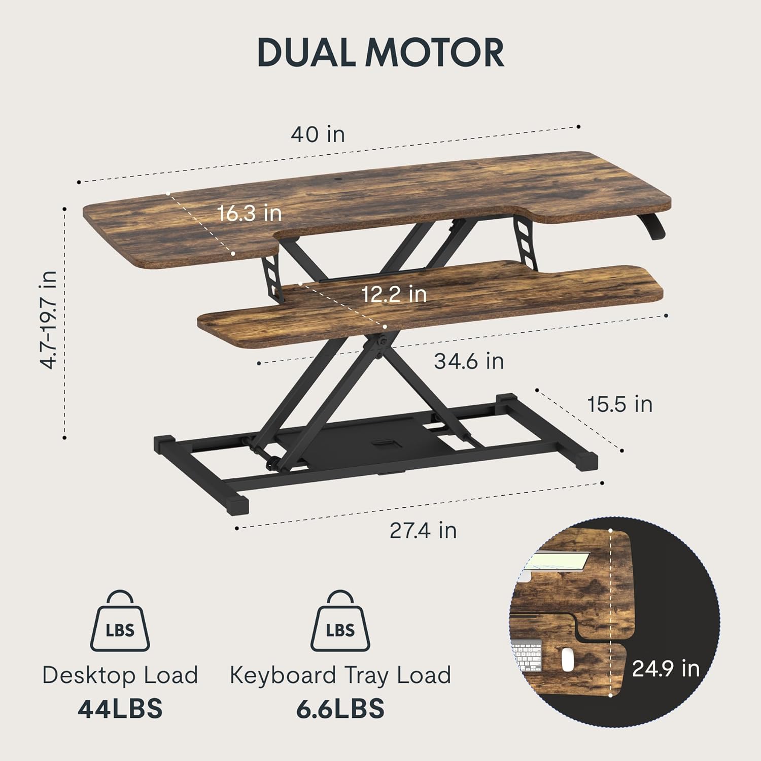 FLXISPOT 40in Standing Desk Converter, Height Adjustable Riser, Manual Lift with Gas Spring Monitor and Laptop Workstation, Rustic Color