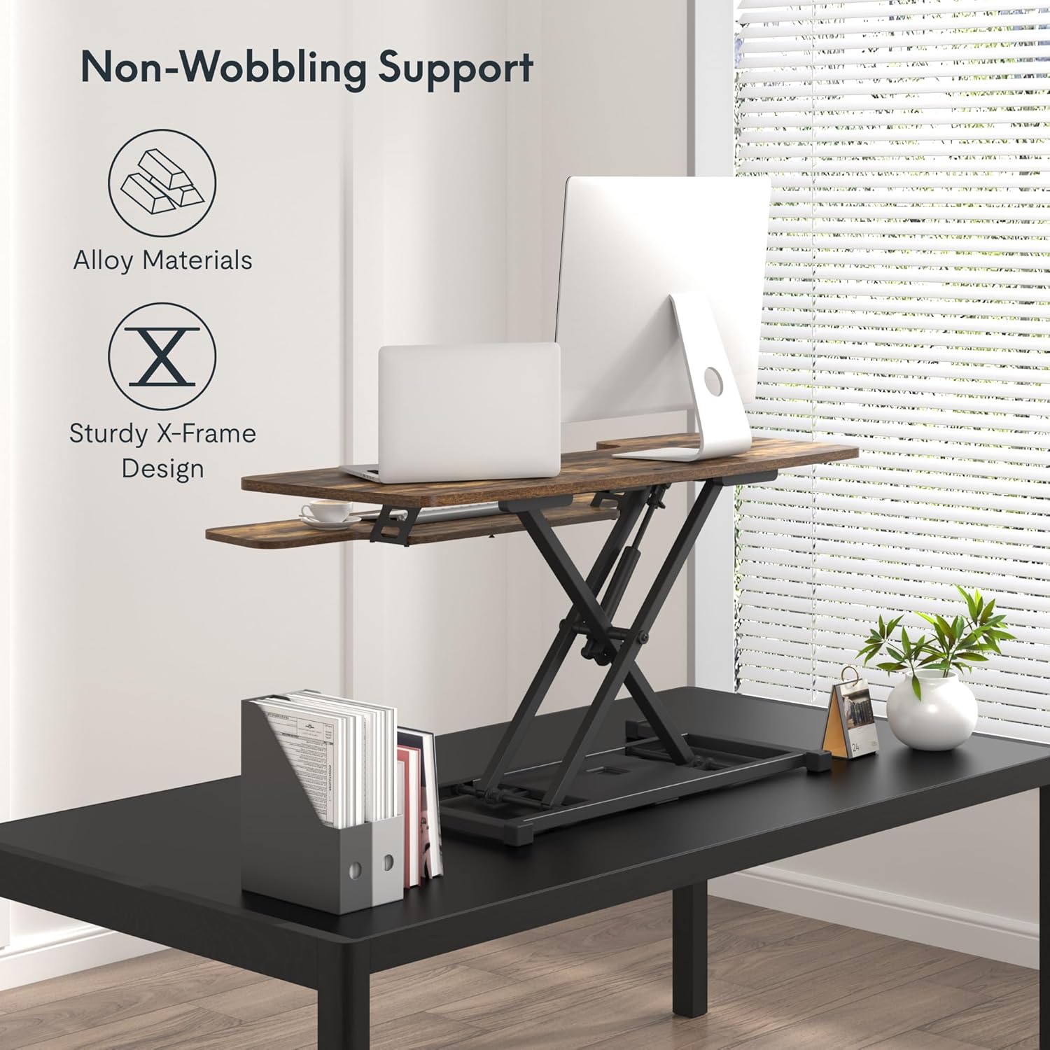 - Durable Build for Lasting Performance: Built with a sturdy X-frame structure, our desk converter is designed to handle the demands of daily use. It supports up to 33 pounds on the upper deck and 6.6 pounds on the keyboard tray, maintaining stability and durability through every height adjustment. Enjoy seamless transitions without worrying about wobbling or tipping.
