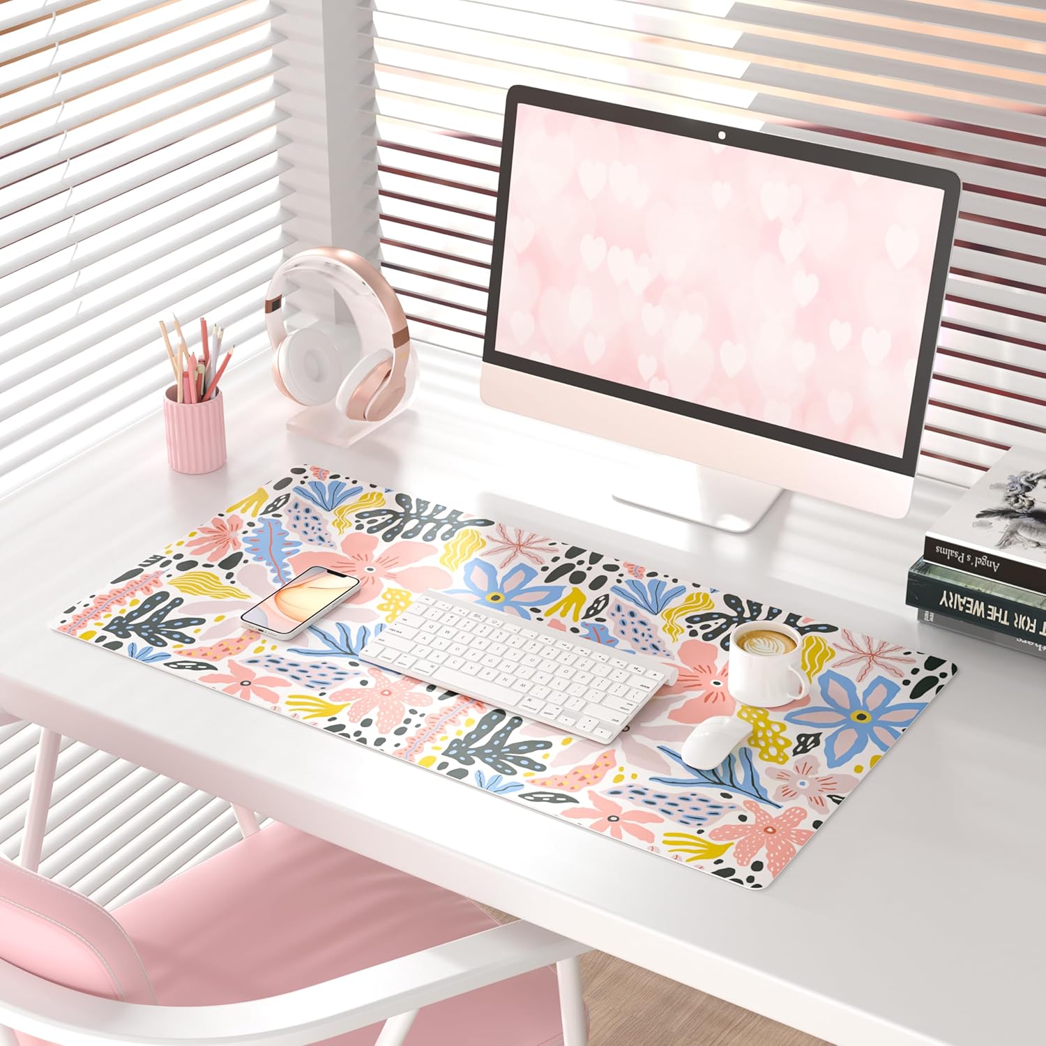 QIYI Floral Large Mouse Pad, Cute Desk Mat for Desktop, Women Girls Desk Accessories Office Décor, PU Leather Waterproof Big Gaming Mousepad, Doodle Flowers Desk Pad Computer Mat, 31.5" x 15.7"