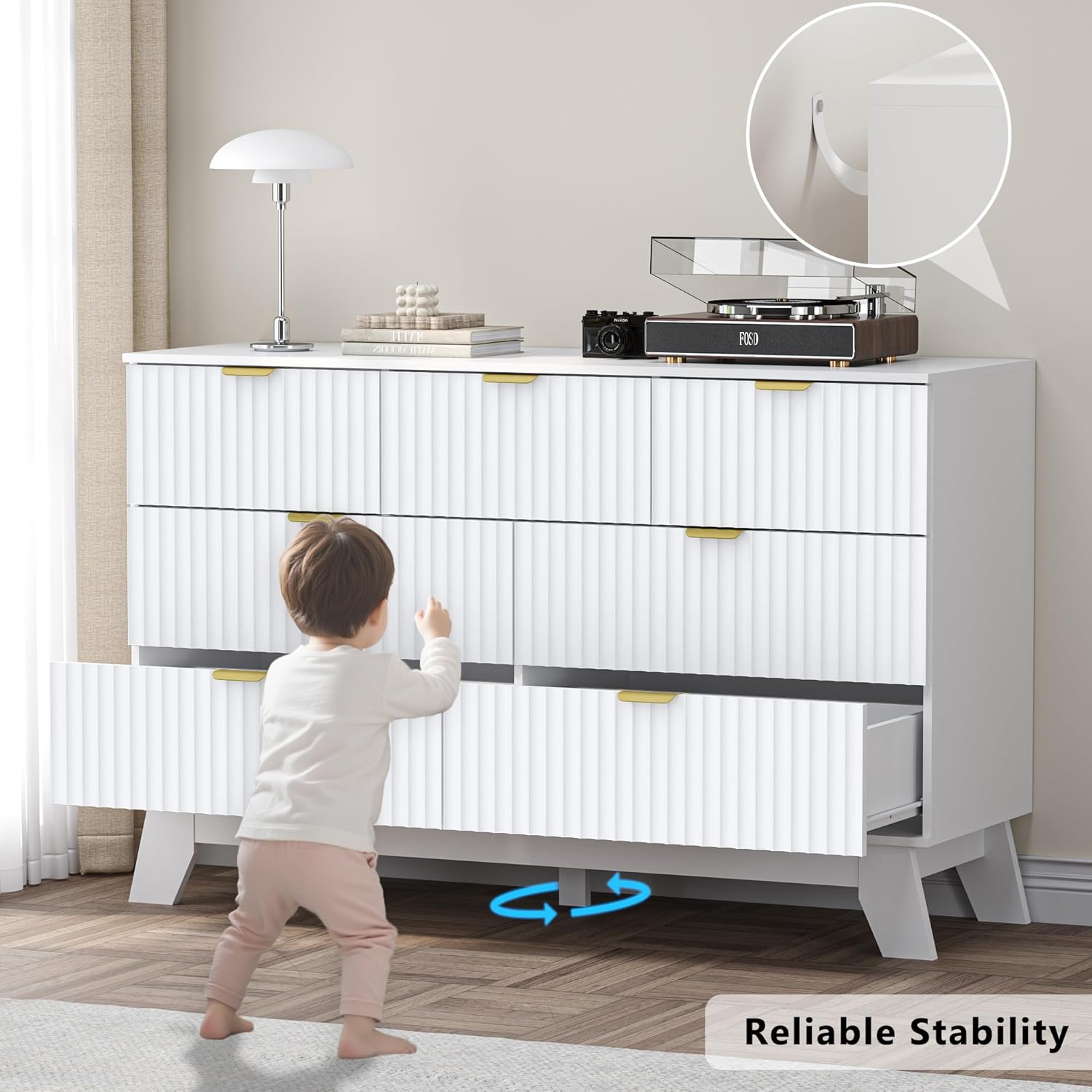 Fluted 7 Drawer Dresser, 47.2" Wide Modern Boho Chest of Drawers, Wooden Storage Dresser TV Stand for Bedroom, Living Room, Closet, Hallway, Curved Profile Design