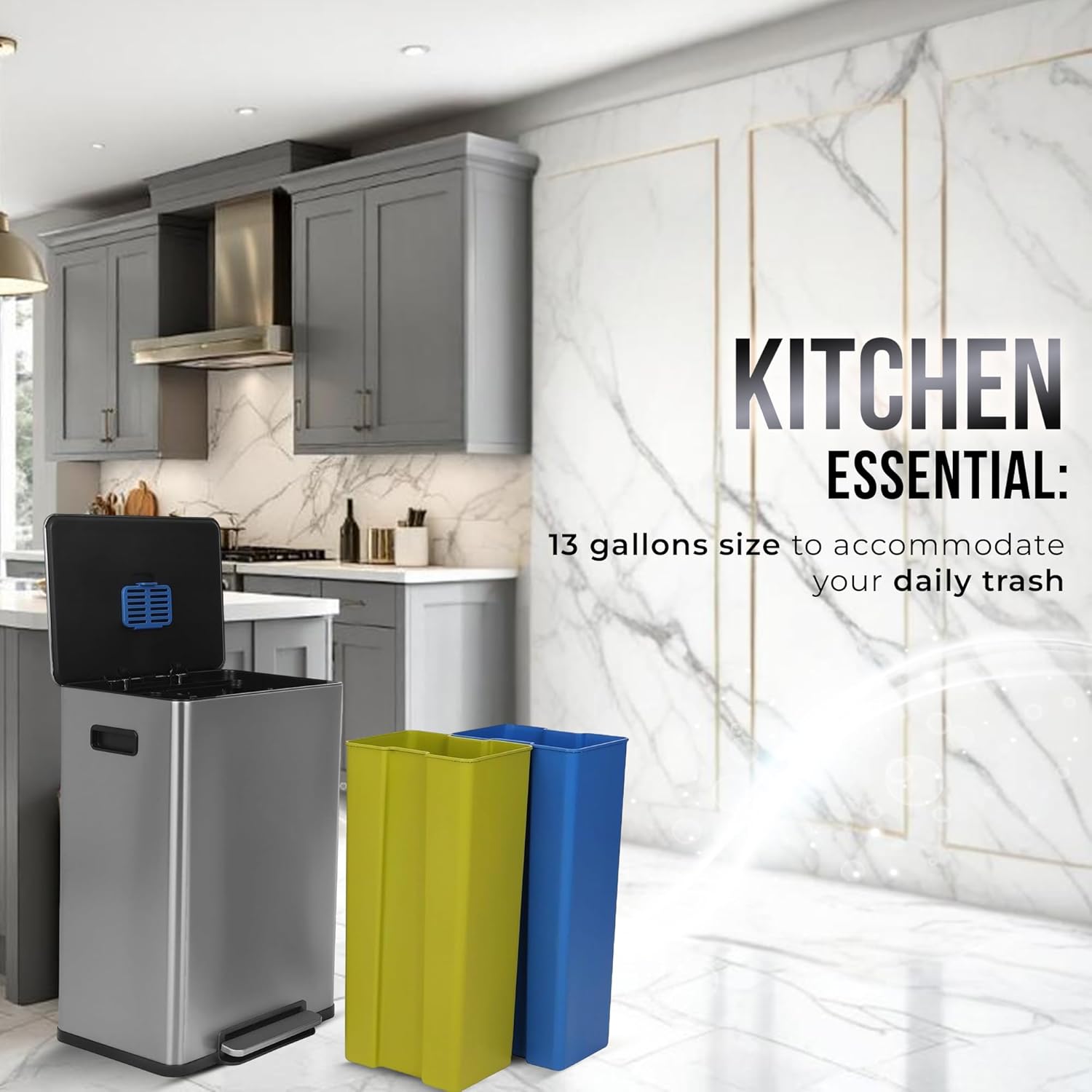 Simpli-Magic 16 Gallon (60L) Step Trash Can – Dual Compartment Kitchen Garbage Can – Waste & Recycling Bins, Slow-Close Lid, Odor Control, Hands-Free, Easy to Clean, Infinity Edge Stainless Steel
