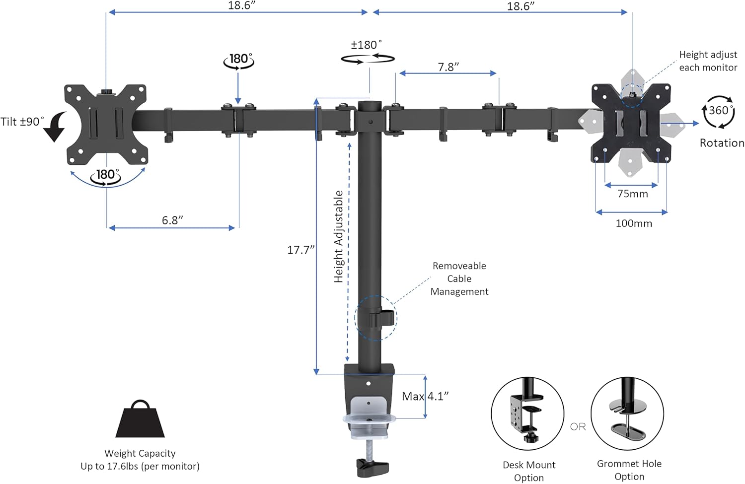 - Standing Desk Converter Bundle includes 45" Desk Riser (R ADRB-45) and Dual Monitor Arm (R DM2) for easy ergonomic positioning and optimal viewing comfort for 13"-27" flat panel monitors. Mount installs directly into convenient desktop grommet hole.