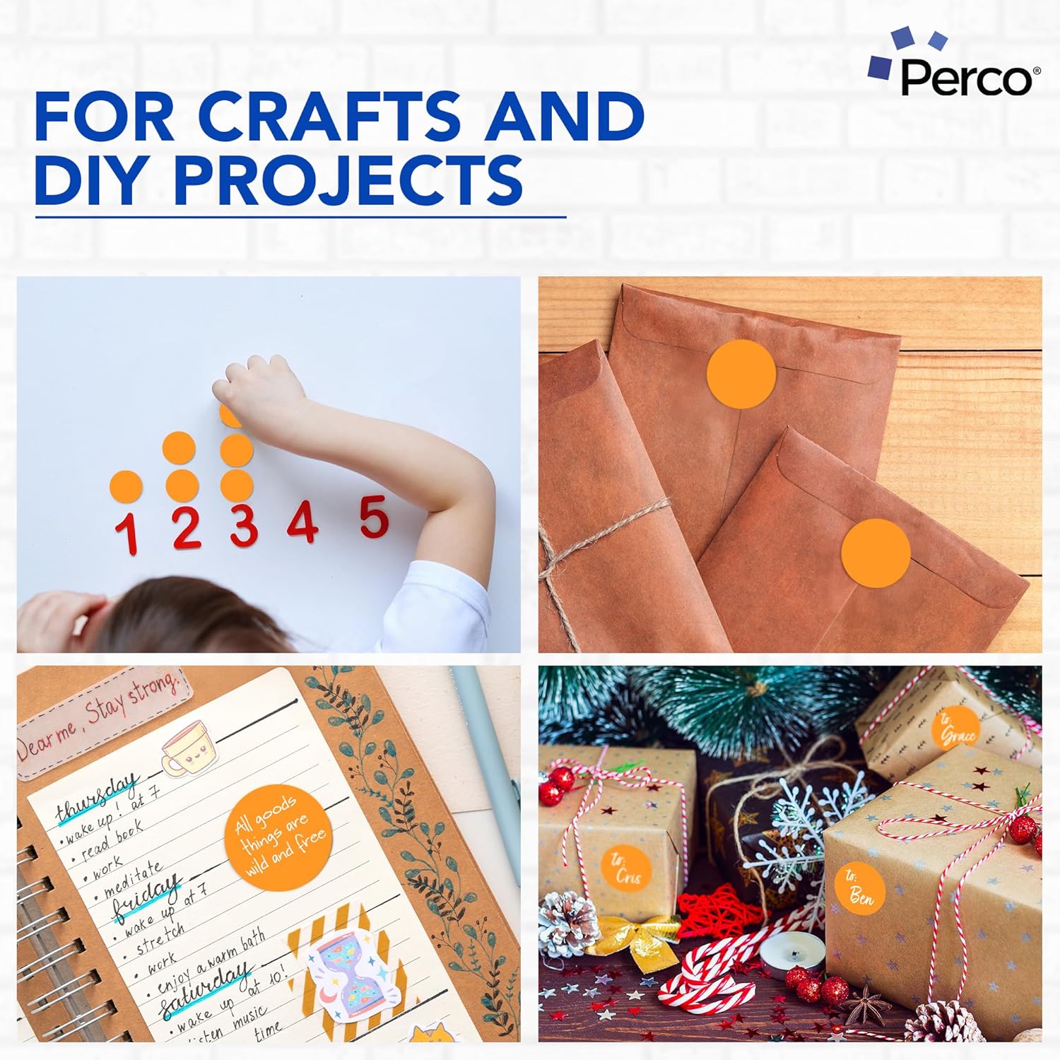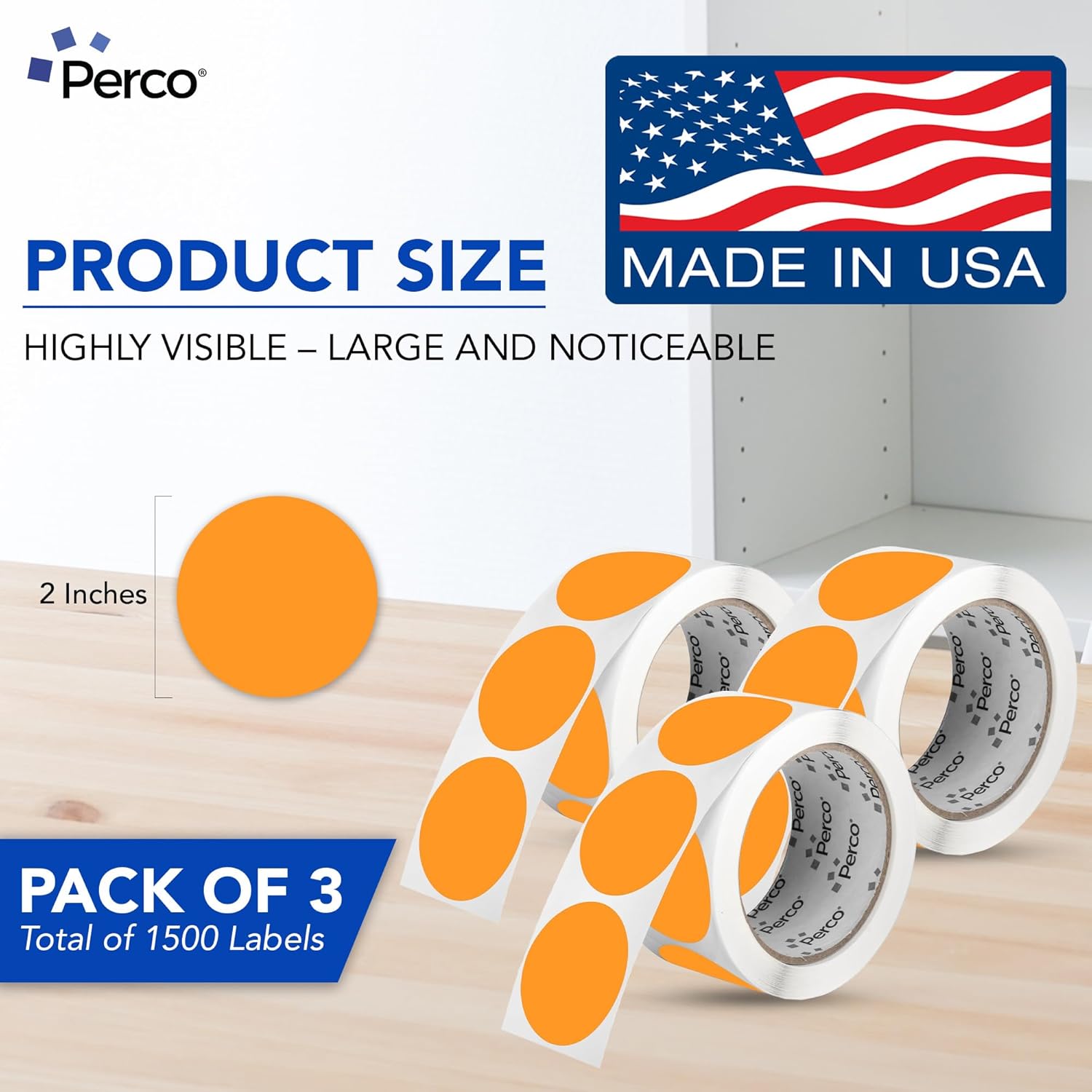 Perco Fluorescent Orange 2-Inch Round Circle Dot Sticker Labels - Multi-Roll Pack (3 Rolls, 500 Labels Each) - Permanent Adhesive, Vibrant Colors, Strong Hold - Perforated for Easy Use - Made in USA