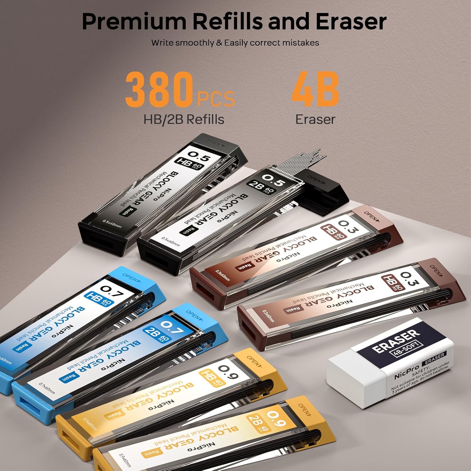- Nicpro Blocky Gear: Come with 4pcs metal 0.3/0.5/0.7/0.9mm mechanical pencil and 8 tubes of replacement leads (3 tubes of 2B (0.5, 0.7, 0.9mm), 5 tubes of HB (2* 0.3mm, 0.5, 0.7, 0.9mm), 60 pcs/tube of 0.3/0.5/0.7mm lead; 40 pcs/tube of 0.9mm lead, 3pcs 4B latex-free eraser, 18pcs replaceable cap erasers,1 pcs kneaded eraser, all the stuff storage neatly in a case with flocking tray,what a gift for friends & family!Ideals for artists, professionals, teachers and students alike.