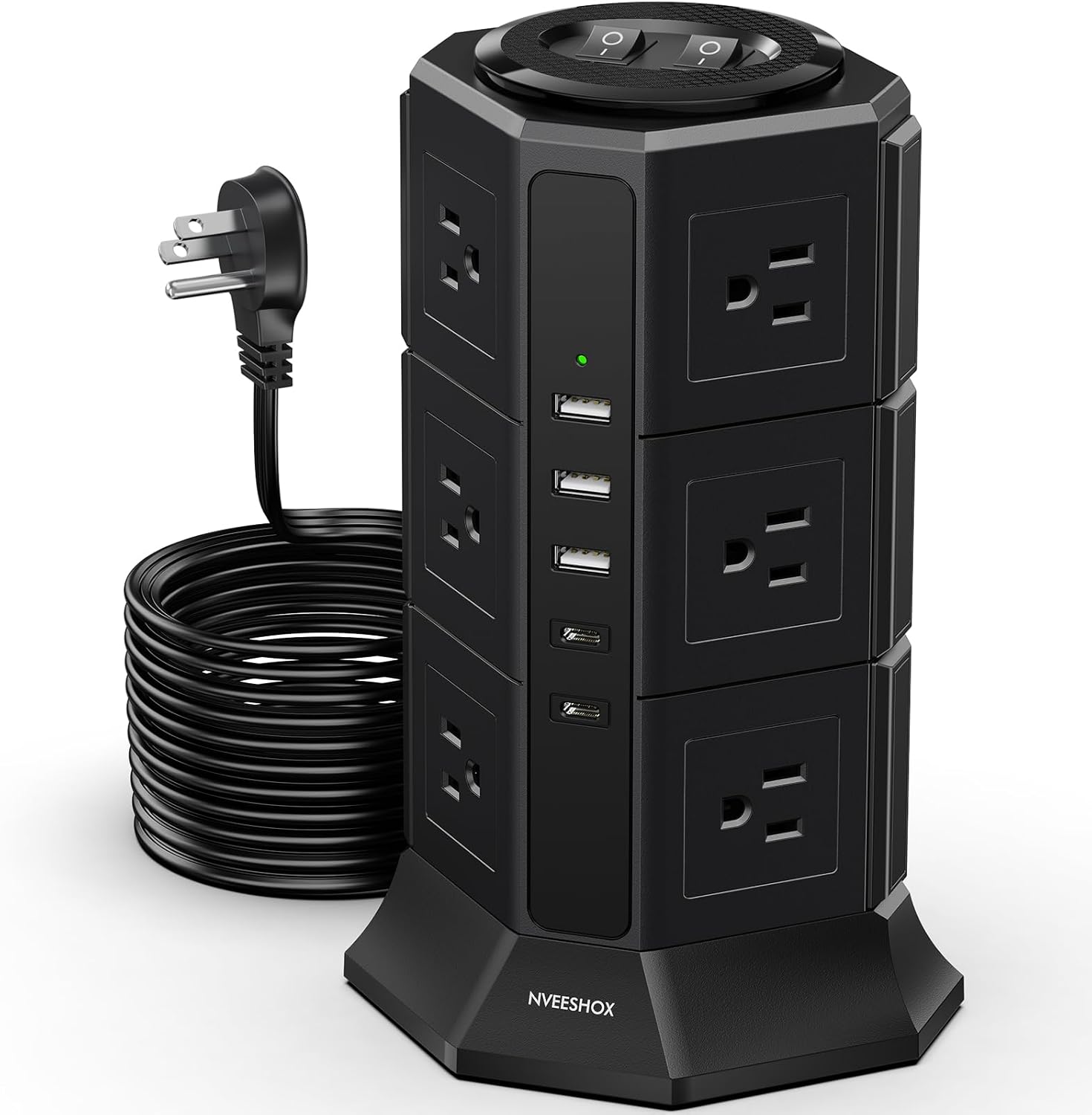 - 1080J SURGE PROTECTOR: The power strip tower is equipped with overload protection, short-circuit protection, over-current protection, and over-heating protection; when affected by lightning strikes, surges, or spikes in voltage, the buttons on the bottom of the outlet extender tower can automatically shut down and protect your expensive electronic devices, providing you with a safe and reliable charging environment.