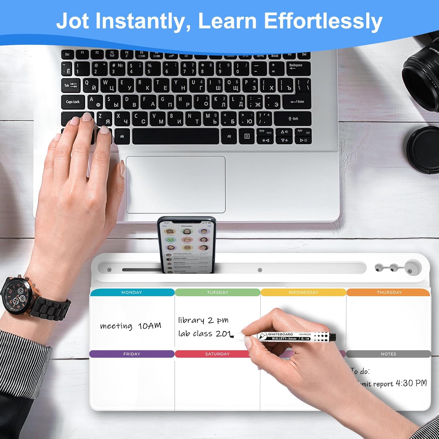 - Weekly Planner Whiteboard - Stay on top of your weekly schedule with ease using our desktop whiteboard. It features a colorful weekly grid with clearly defined sections for each day and notes. Crafted from tempered glass, it offers a smooth writing experience and effortless clean-up—no stains, no scratches. Perfect for organizing tasks, writing to-do lists, and taking quick reminders.