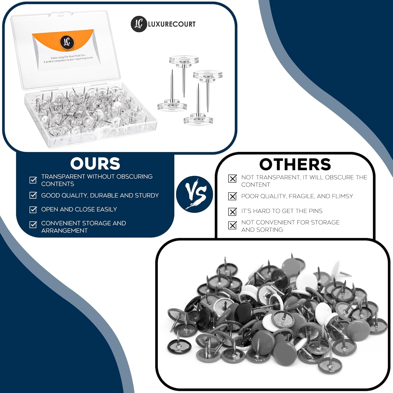 150 Pack Clear Push Pins Tacks by Luxurecourt, Flat Head Thumbtacks for Bulletin Board, Wall Hanging, Cork Board, Shadow Box, Heavy Duty Plastic Head with Steel Point in Reusable Storage Box.