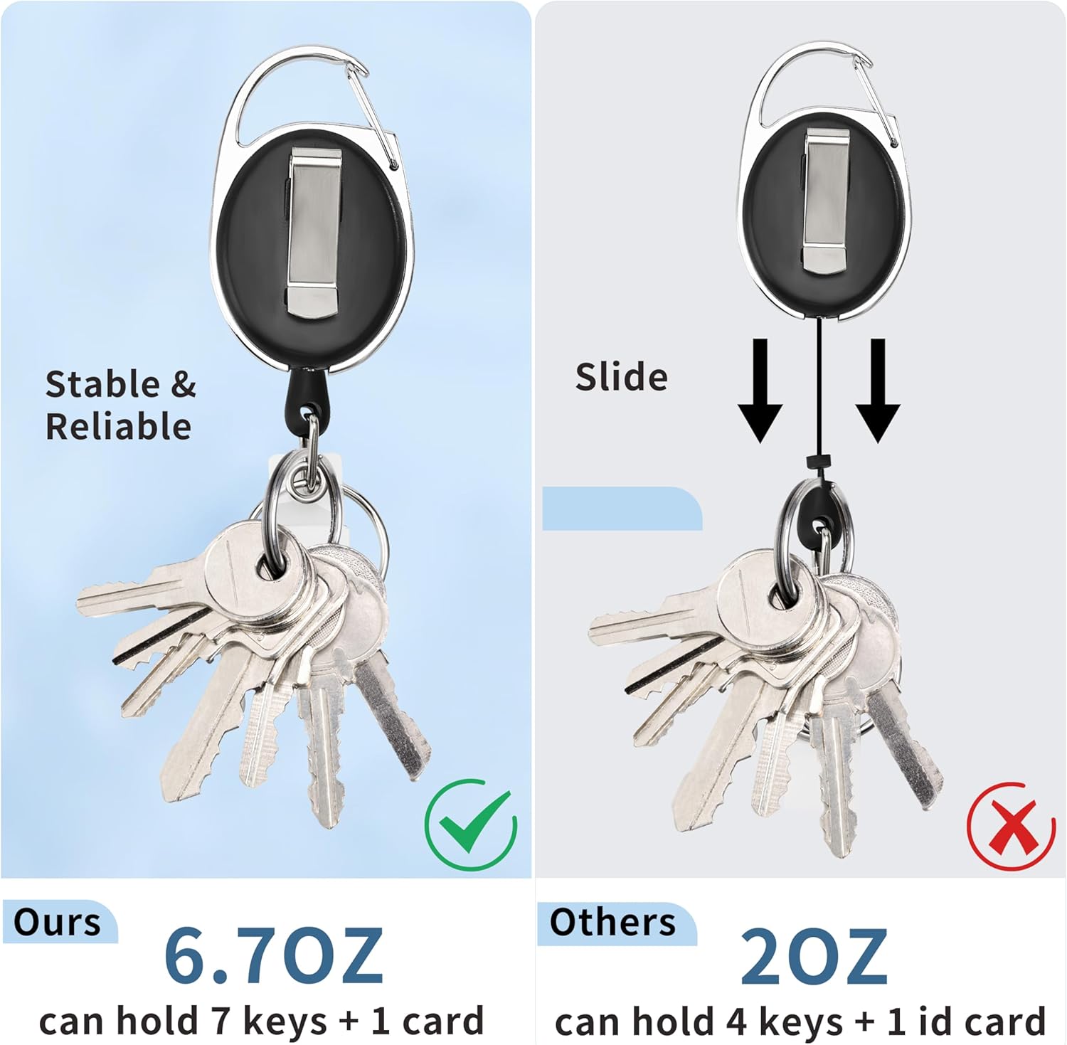 - Reinforced Design, Stronger Load Capacity: Made with a premium retractable lanyard cord that is 3 times stronger than standard nylon ropes, offering exceptional durability and wear resistance. With a maximum load of 6.7oz (approx. 7 keys), it outperforms most retractable badge holders on the market. Triple-reinforced snap fasteners ensure a more secure connection.