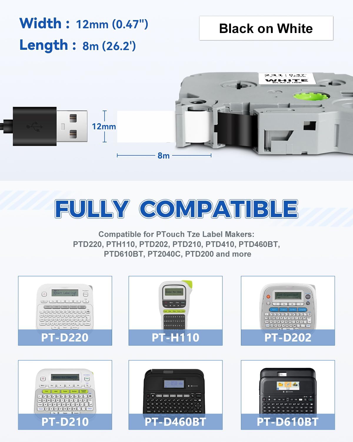 - Compatible for Brother P Touch Tze 12mm Label Makers: PT-D220, PT-D200, PT-D202, PT-D210, PT-D410, PTD460BT, PT-2040W, PT-2040SC, PT-2040C, PT-D201, PT-D215e, PT-E100, PT-E105, PT-E110, PT-H100, PT-H105, PT-H110, PT-H111, PT-H200, PT-P300BT, PT-D400, PT-D450, PT-E300, PT-H300, PT-D600, PT-E500, PT-E550W, PT-H500, PT-P700, PT-P710BT, PT-P715eBT, PT-P750W, PT-D800W, PT-E800W, PT-P900, PT-P900W, PT-P950NW, PT-P910BT