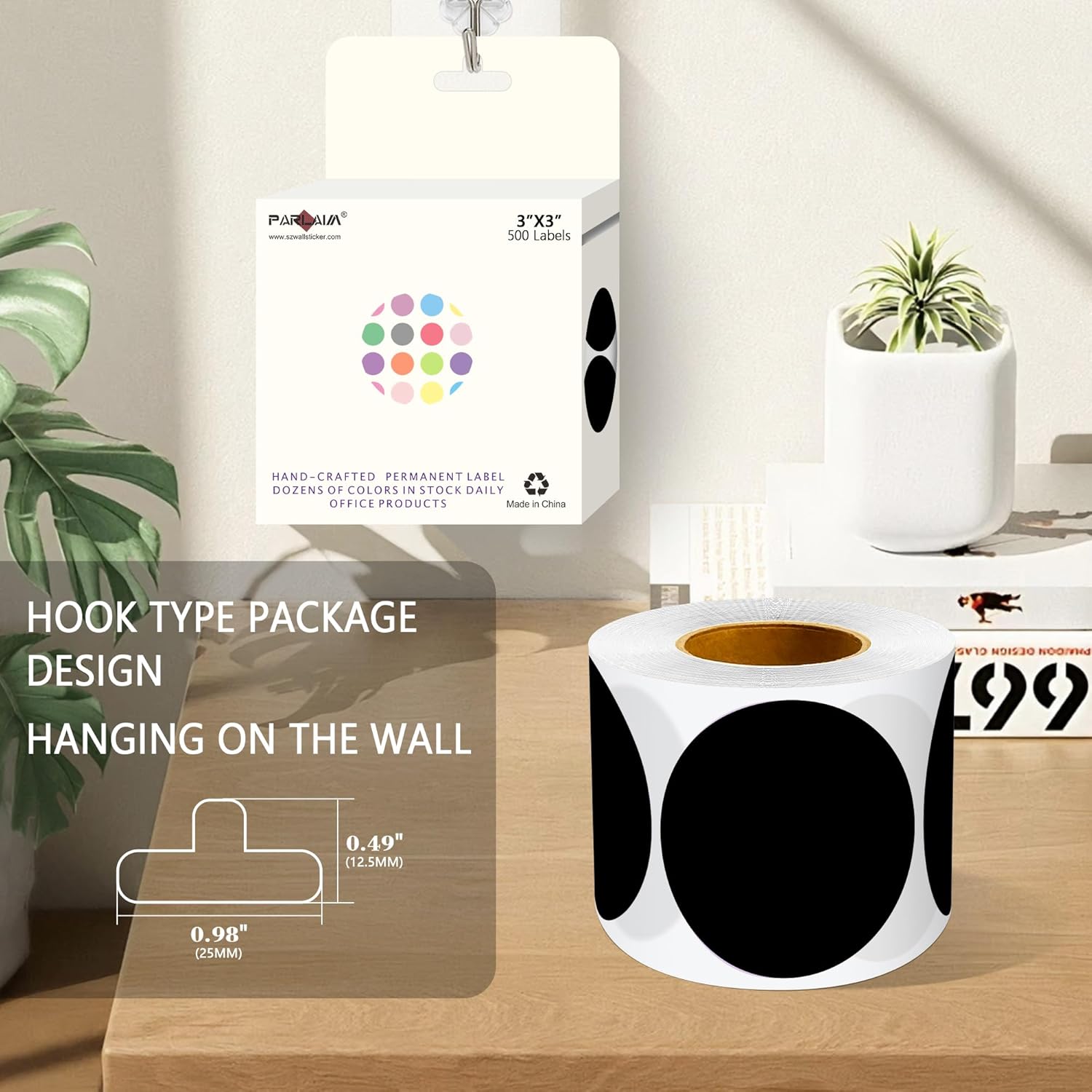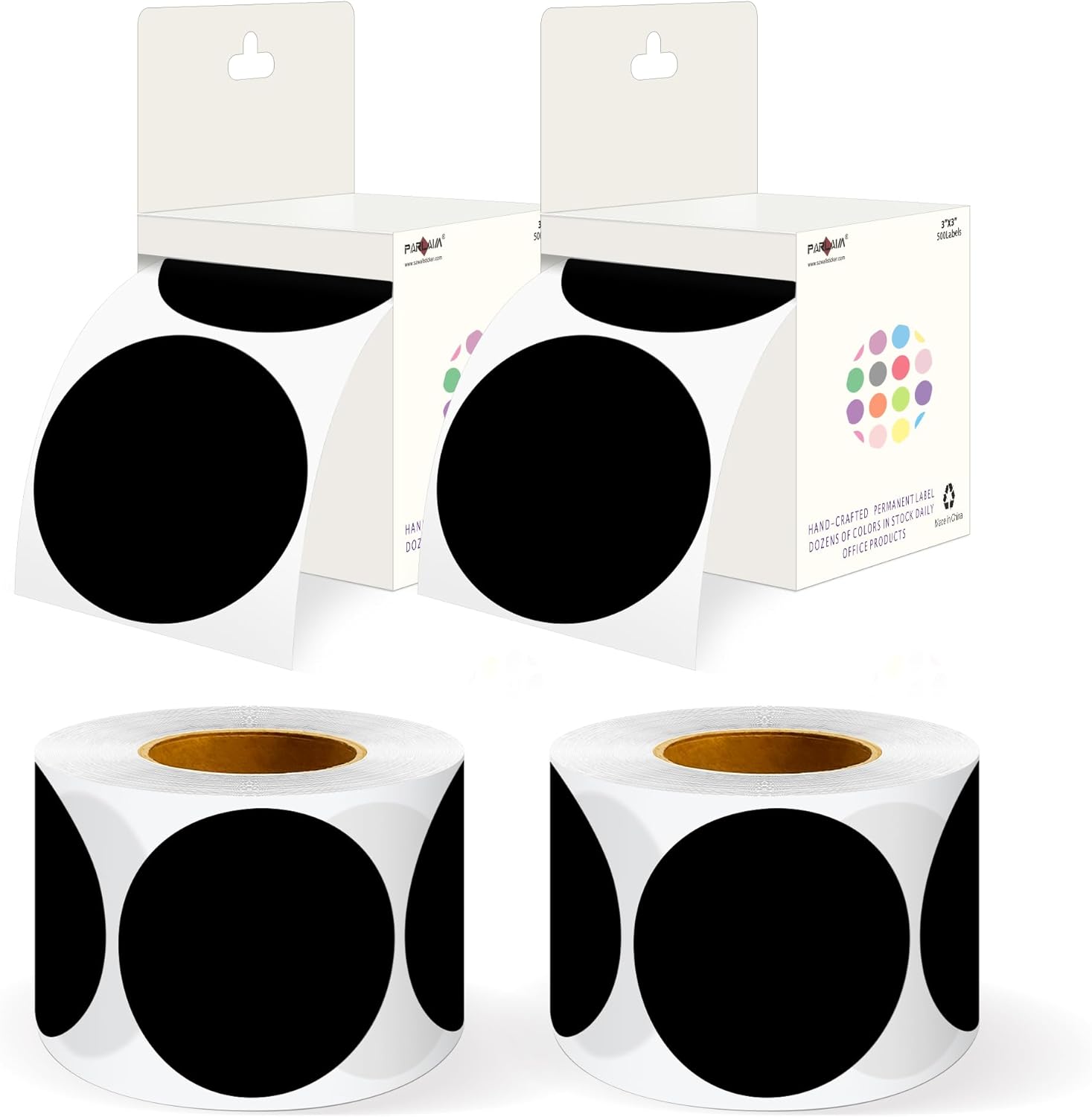 - The package includes 4 rolls 2000PCS 3x3 Inch round diameter black color-code dots stickers, each roll sticker label in a individual plastic dispenser case and 4 rolls in a larger box.