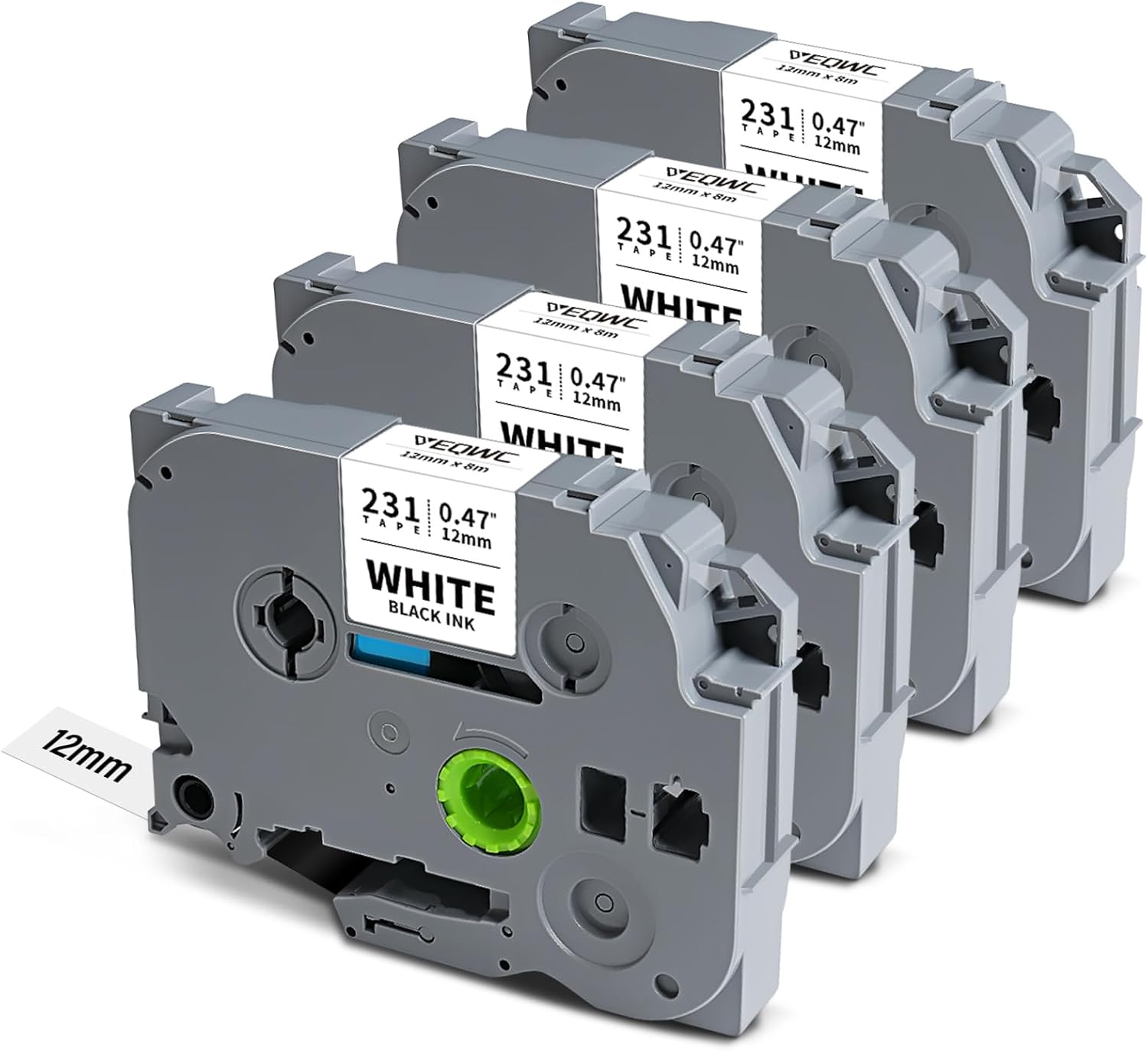 Tze Label Maker Refill Tz-231 Compatible for Brother Ptouch Tze-231 Tze231 12mm 0.47 Laminated White Tape 1/2 Inch Tz Tape for P Touch PT-D210 PT-H110 PT-D220 PT-D400 PT-H111 PT-D410, 4 Pack