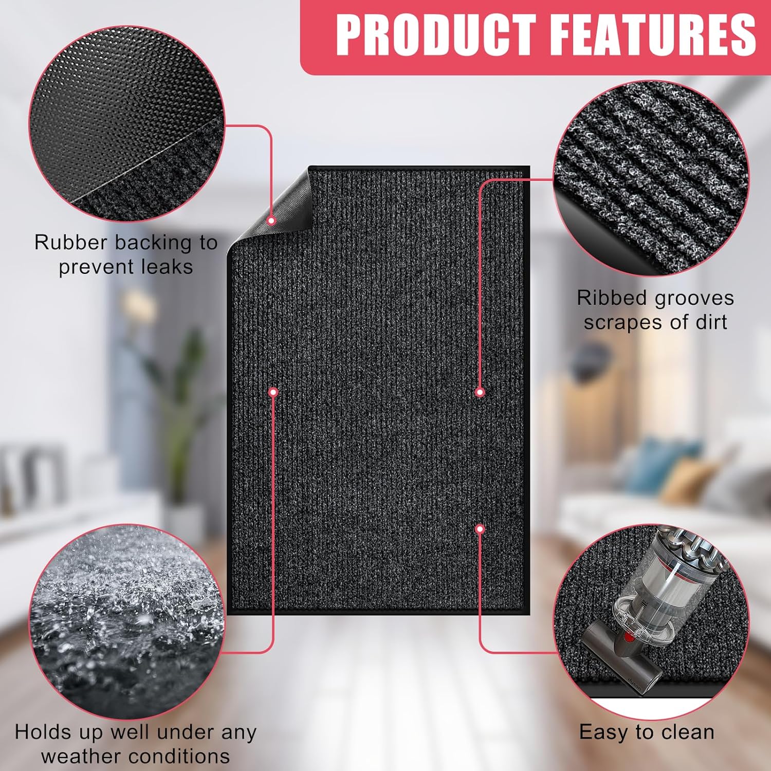 - [EFFECTIVELY ABSORBS DUST AND MOISTURE] Say goodbye to the hassle of tracking dust and moisture into your home. Our front doormat features deep grooves that effectively trap dirt, mud, and moisture from shoes, keeping your floors clean and preventing potential damage.