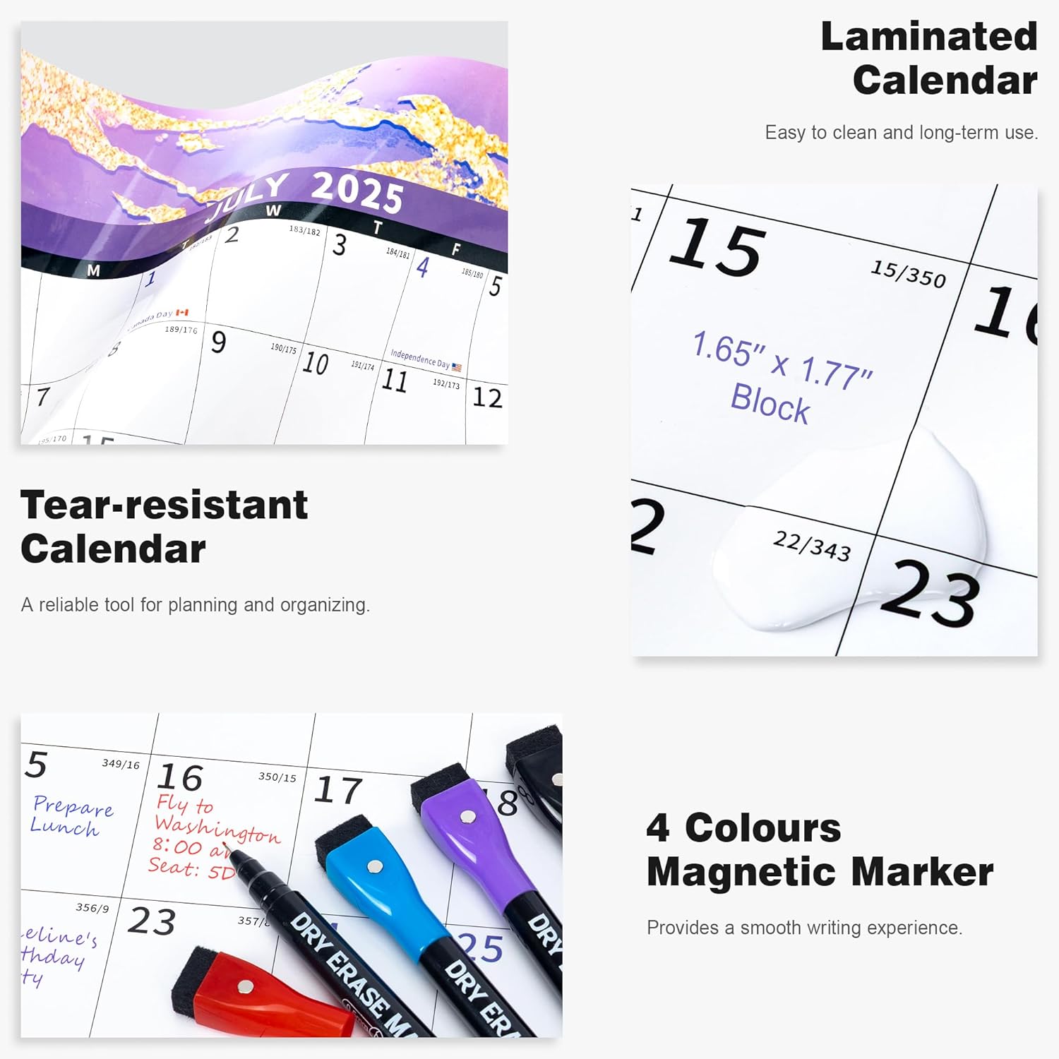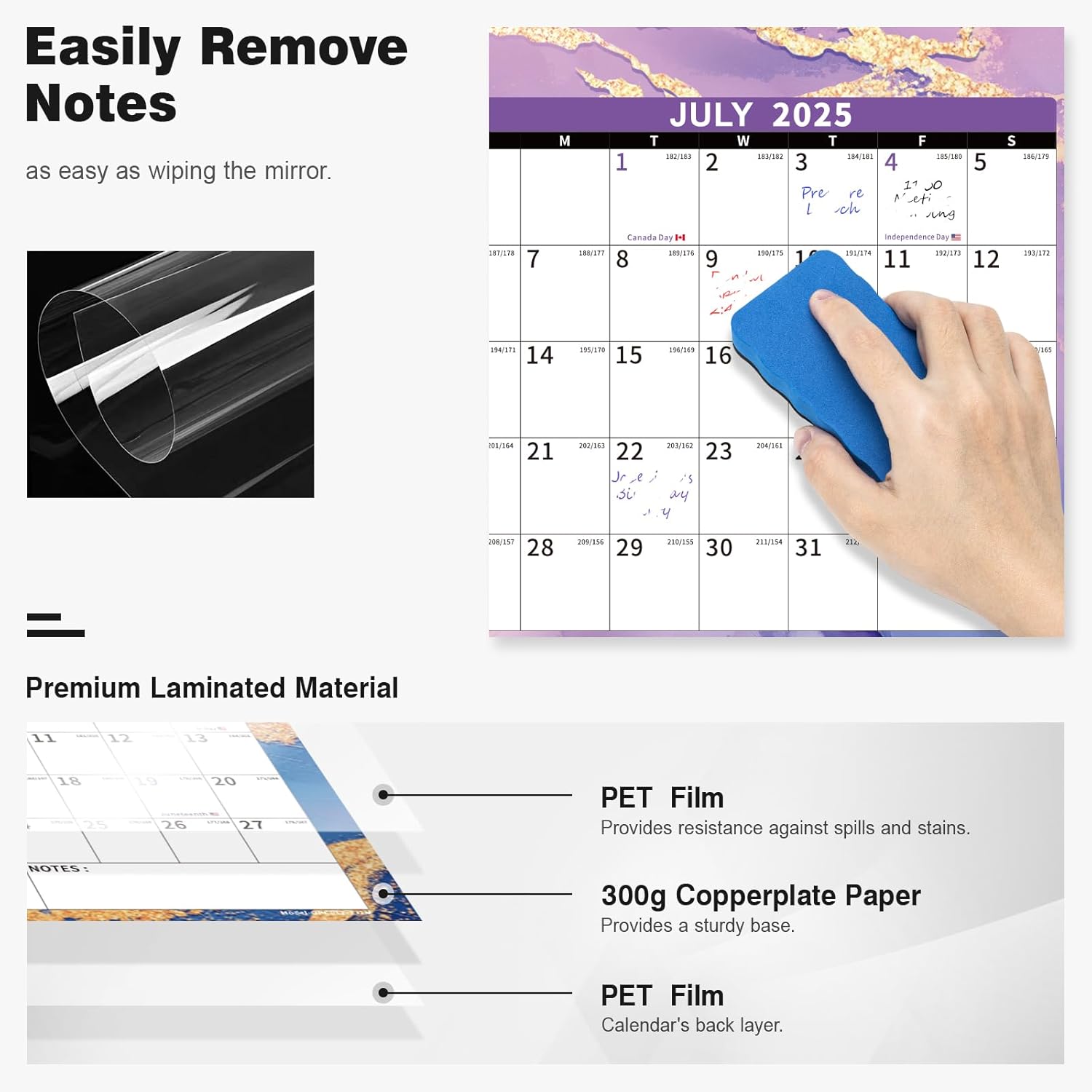 - ✨ Dry Erase Wall Calendar : is made of PET Film and 300 grams Copperplate Paper, providing a durable surface that resists scratches and smudges, while the sturdy Copperplate Paper backing keeps it in place without curling.