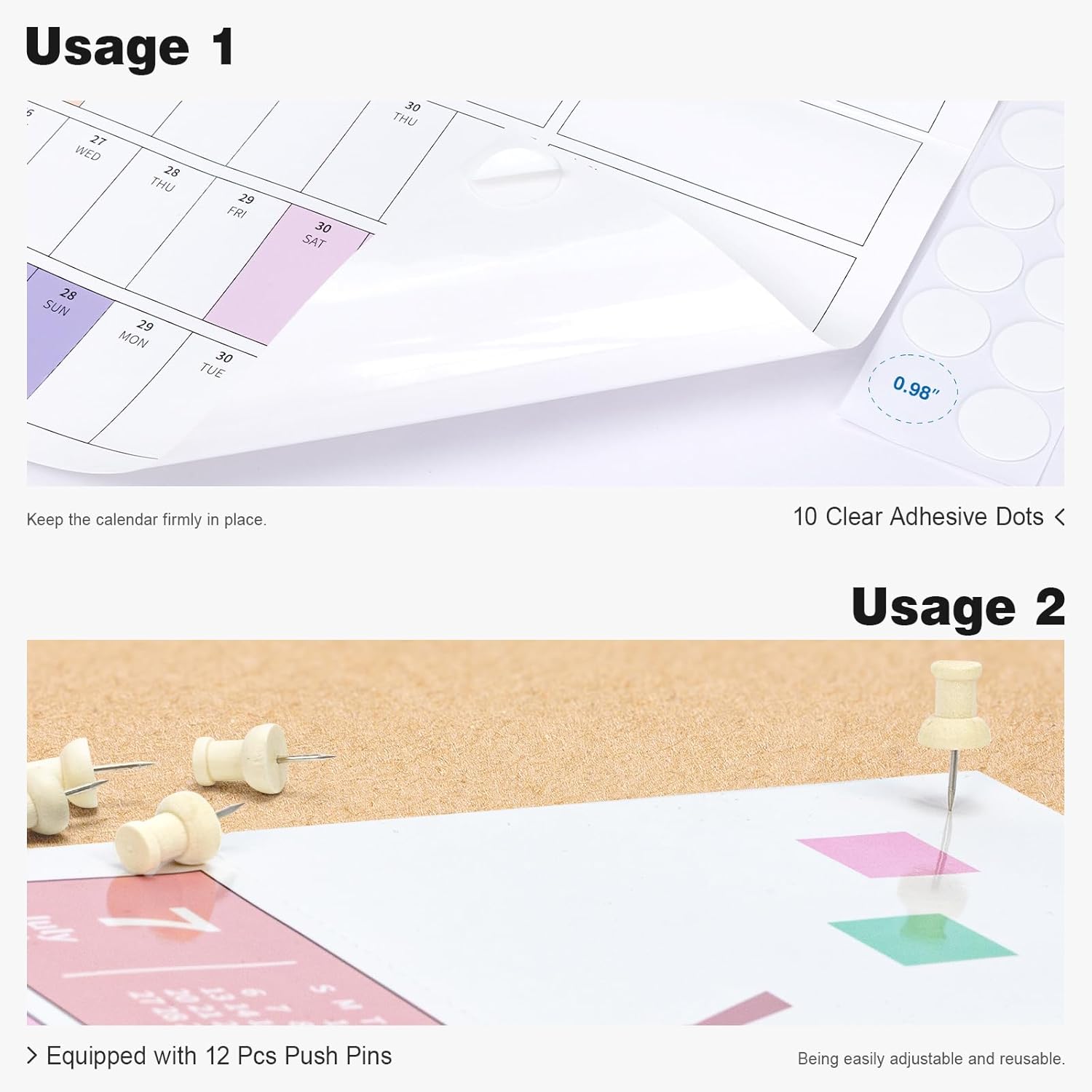 - ✨ Laminated Calendar with Dates: Waterproof wall calendar comes with a mini eraser, four dry-erase markers, 12 push pins, and 10 transparent round stickers. 12 months calendar covers the time range from July 2025 to June 2026, making it perfect for long-term use.