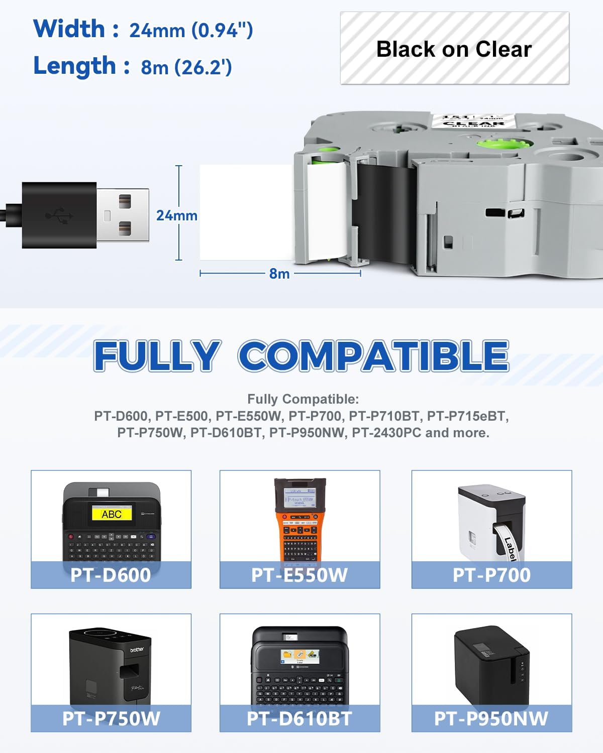 - Compatible for Brother Tze 24mm Label Makers: PTD610BT, PTD610BTVP, PTD600, PTP700, PTP710BT, PTE550W, PTP750W, PTE500, PTH500, PTP715eBT, PTD800W, PTE800W, PTP900, PTP900W, PTP950NW, PTP910BT