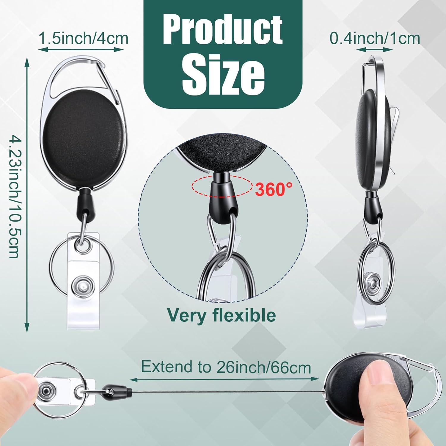 - Size: retractable keychain size is 4.13 x 1.57 inch/ 10.5 x 4 cm, designed with a retractable cord, can extend up to 26 inch/ 66 cm long, the retraction mechanism is very smooth, will not get stuck, and not easy to break, easy to enter and exit various places