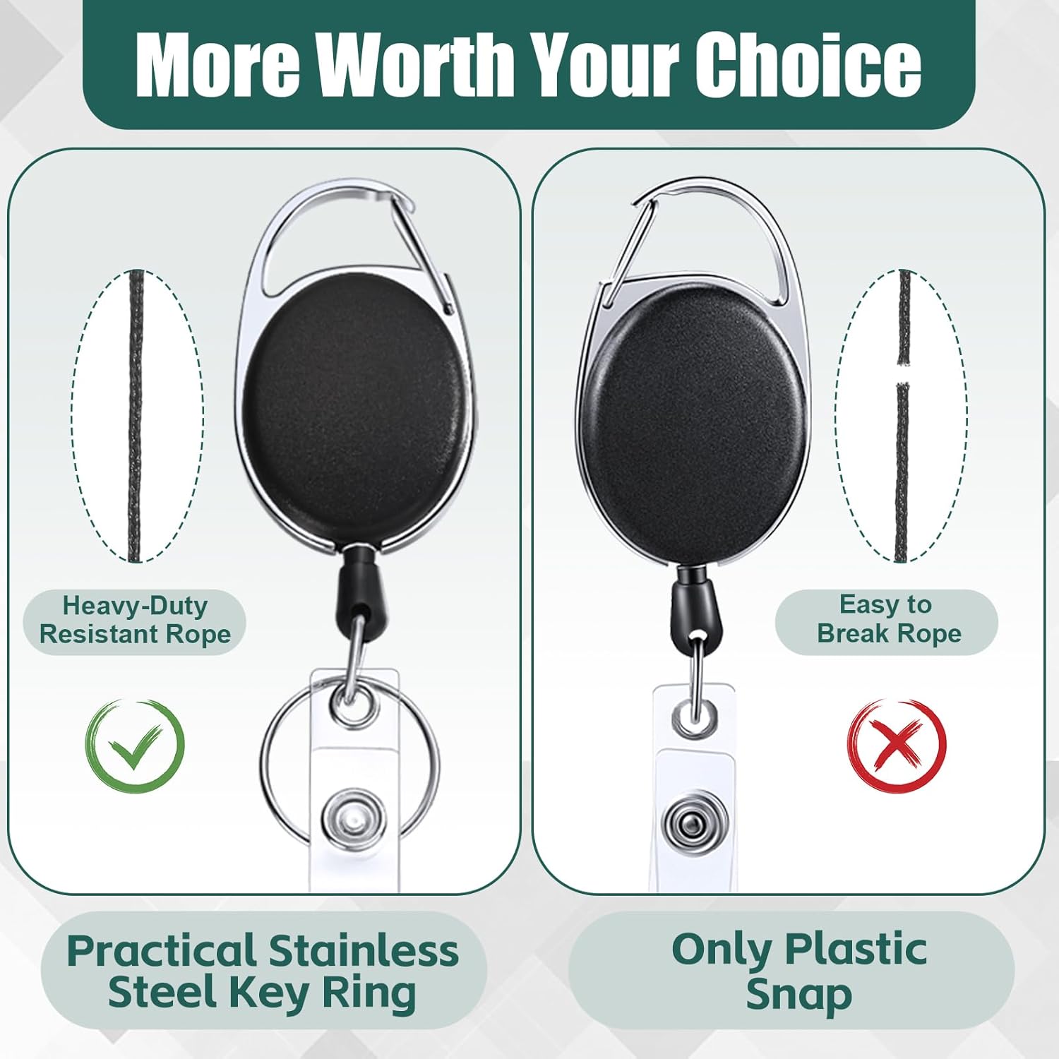 - Materials: retractable badge reels are composed of wear resistant polyester retractable fiber cord, good matte texture plastic round reel case, plastic strip with snap, metal key ring and clip, the fiber cord that is compact and sturdy, retraction force up to 4 oz/ 113 g