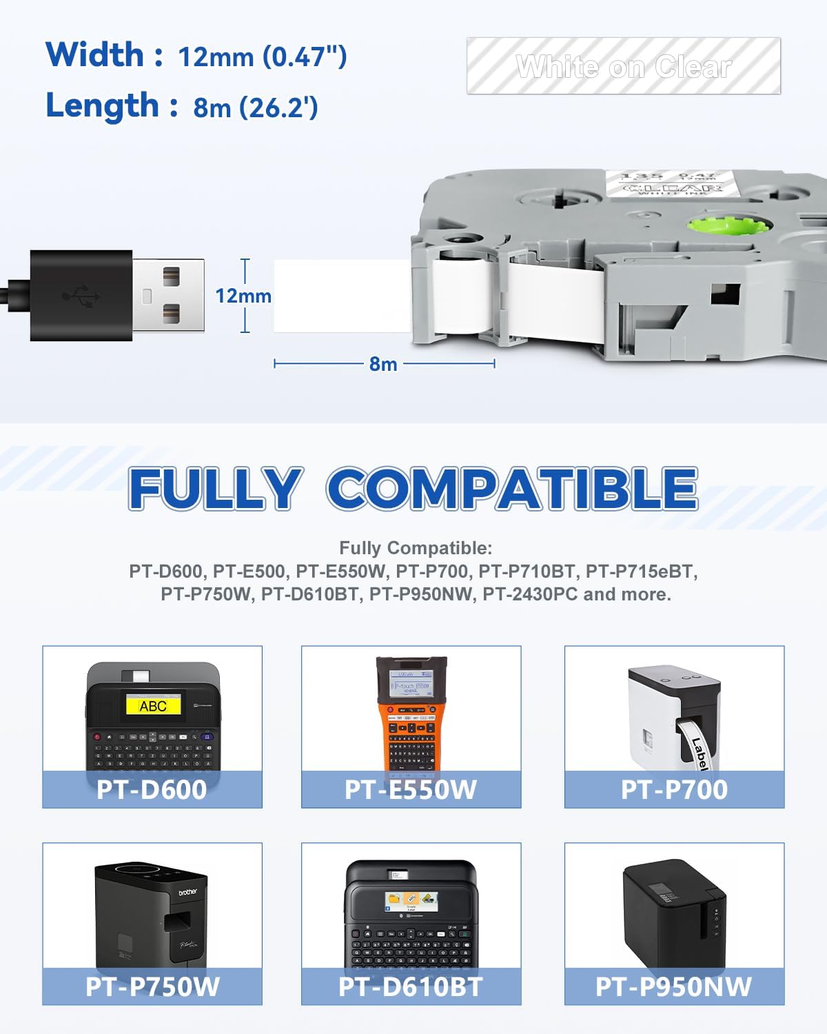 - Packages: 4-Pack 12mm 0.47" clear label tape compatible with Brother tze-135 12mm 0.47 white on clear tape. Color: White on Clear. Size: 1/2 inch (12mm 0.47") x 26.2 feet (8m)