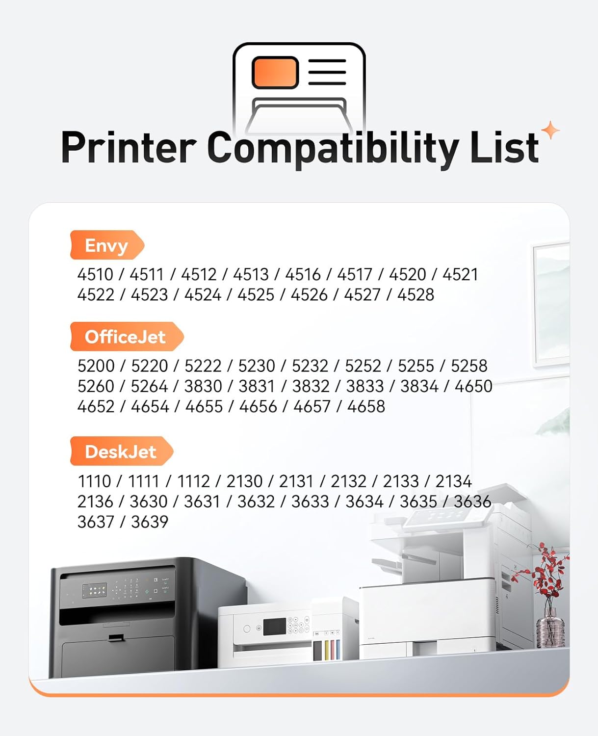 - Compatible with HP Envy series: 4510, 4511, 4512, 4513, 4516, 4517, 4520, 4521, 4522, 4523, 4524, 4525, 4526, 4527, 4528 printers. Compatible with HP OfficeJet series: 5200, 5220, 5222, 5230, 5232, 5252, 5255, 5258, 5260, 5264, 3830, 3831, 3832, 3833, 3834, 4650, 4652, 4654, 4655, 4656, 4657, 4658 printers. Compatible with HP DeskJet series: 1110, 1111, 1112, 2130, 2131, 2132, 2133, 2134, 2136, 3630, 3631, 3632, 3633, 3634, 3635, 3636, 3637, 3639 printers.