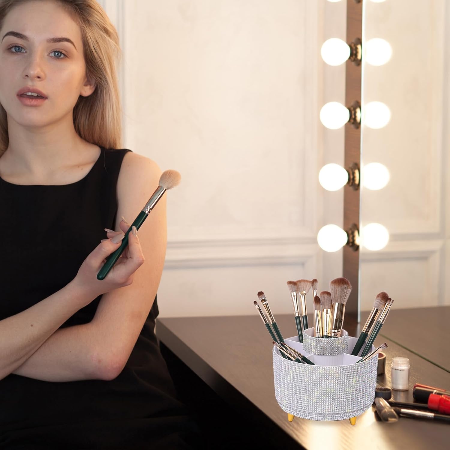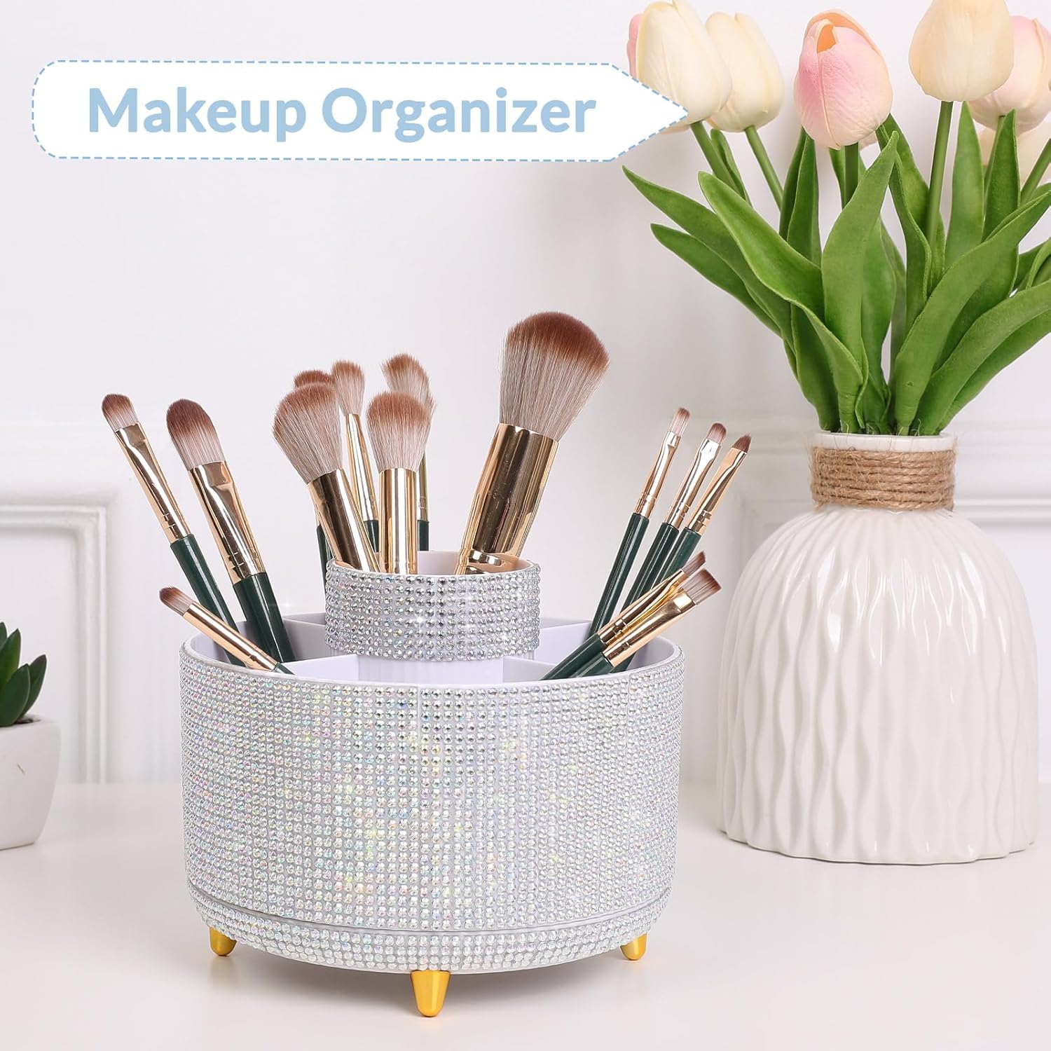 SKYDUE 360 Degree Rotating Desk Organizer, Shining Dual-Purpose Rhinestone Pencil Pen Holder, Rotating Desk Pen Organizer with 5 Slots, Rhinestone Pencil Cup for Office, School, Home