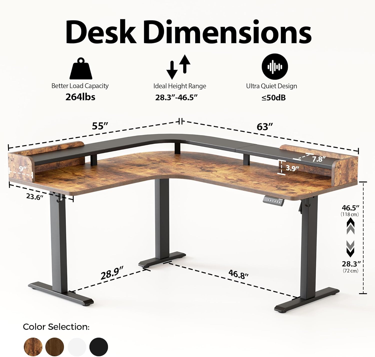 Agilestic L Shaped Standing Desk, Adjustable Height Corner Gaming Desk with Shelf, Sit Stand Up Desk, 63 x 55 Inch Home Office Computer Table, Rustic Brown