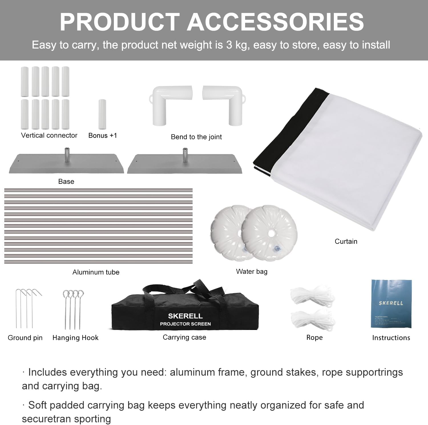 - Quick and Easy Setup:Setting up this projector screen stand is a breeze! With no tools required, you can have it ready in just 5 minutes by following the simple instructions. For added stability in windy conditions, the package includes ropes, nails, and water bags to secure the screen, ensuring uninterrupted outdoor entertainment.