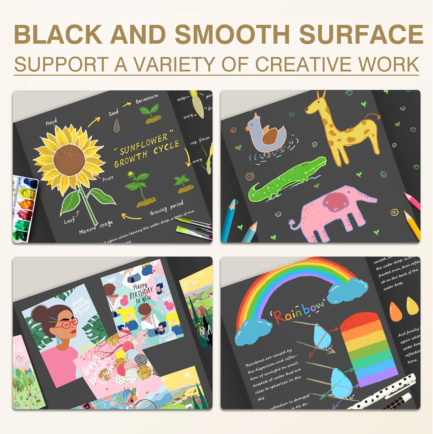 - Creative-Friendly Surface: Smooth black surface works well with common tools like crayons, paints, and stickers