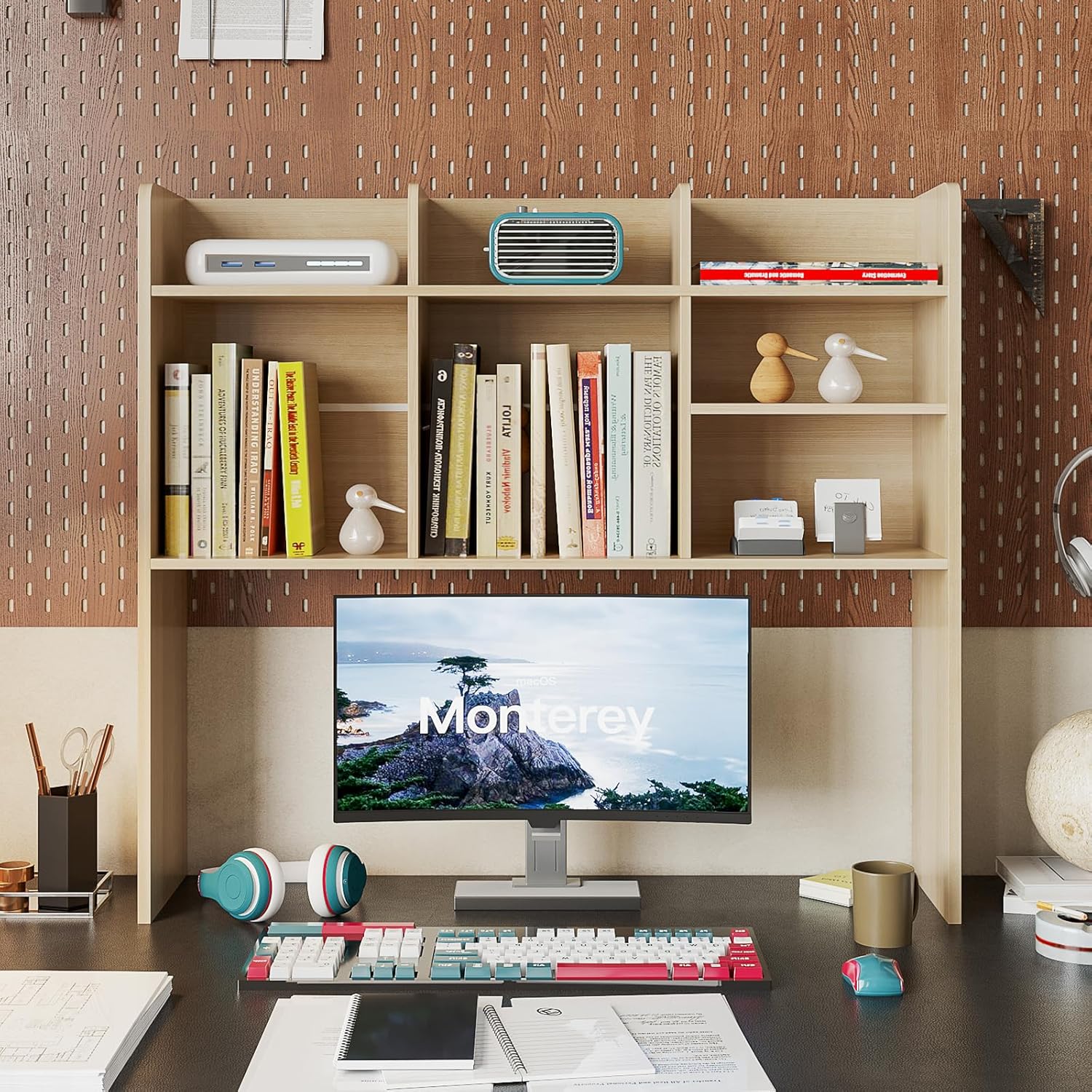 ChooChoo Desktop Bookshelf, Wood Desk Hutch Organizer with 7 Shelves for Computer Desk, Desktop Shelf Bookshelf Storage for College Dorm Office Home, Natural