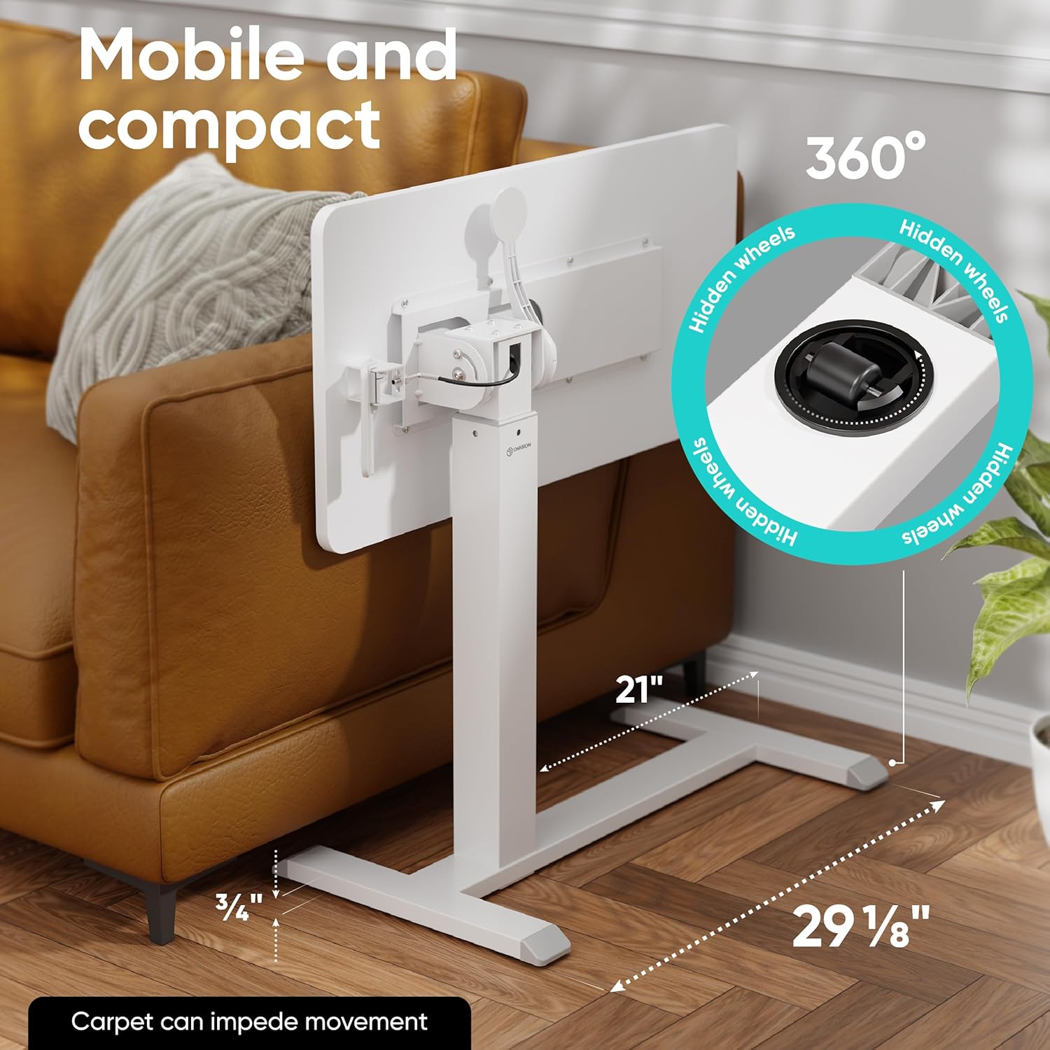 - Compact Rolling Desk – Save space by turning the tabletop 90° and sliding the mobile desk workstation in. The base is only 0.8" high, making it easy to store. Adjustable overbed table with wheels is a space-saving solution for compact apartments and office spaces.