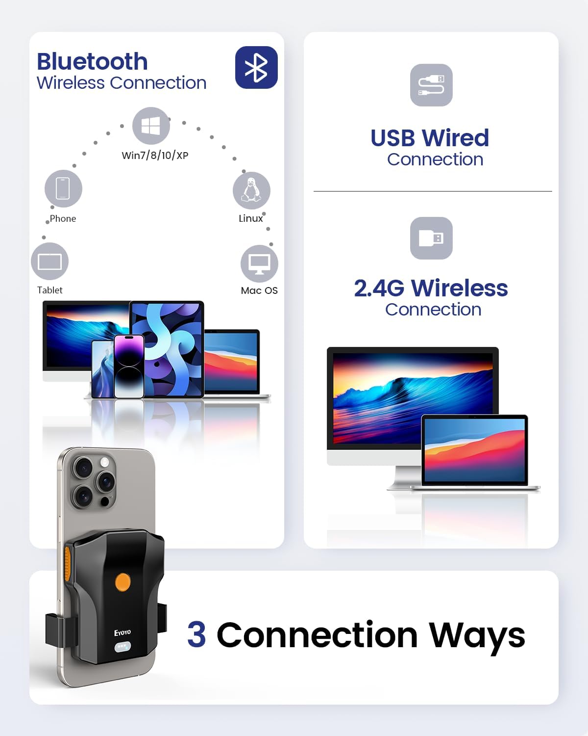 - 3-in-1 Connection Ways – Cordless & Corded Freely Switch: Equipped with 3 connection methods: Bluetooth, 2.4G wireless and USB wired, this Bluetooth barcode scanner lets you easily switch between wired and wireless modes to suit your needs. Wireless options reduce wired limitations, while wired options offer a more stable and reliable setup. It can smoothly connect to a wide range of devices, including laptops, PCs, Macs, iPhones, Androids, tablets, and POS systems. No limit to connectivity