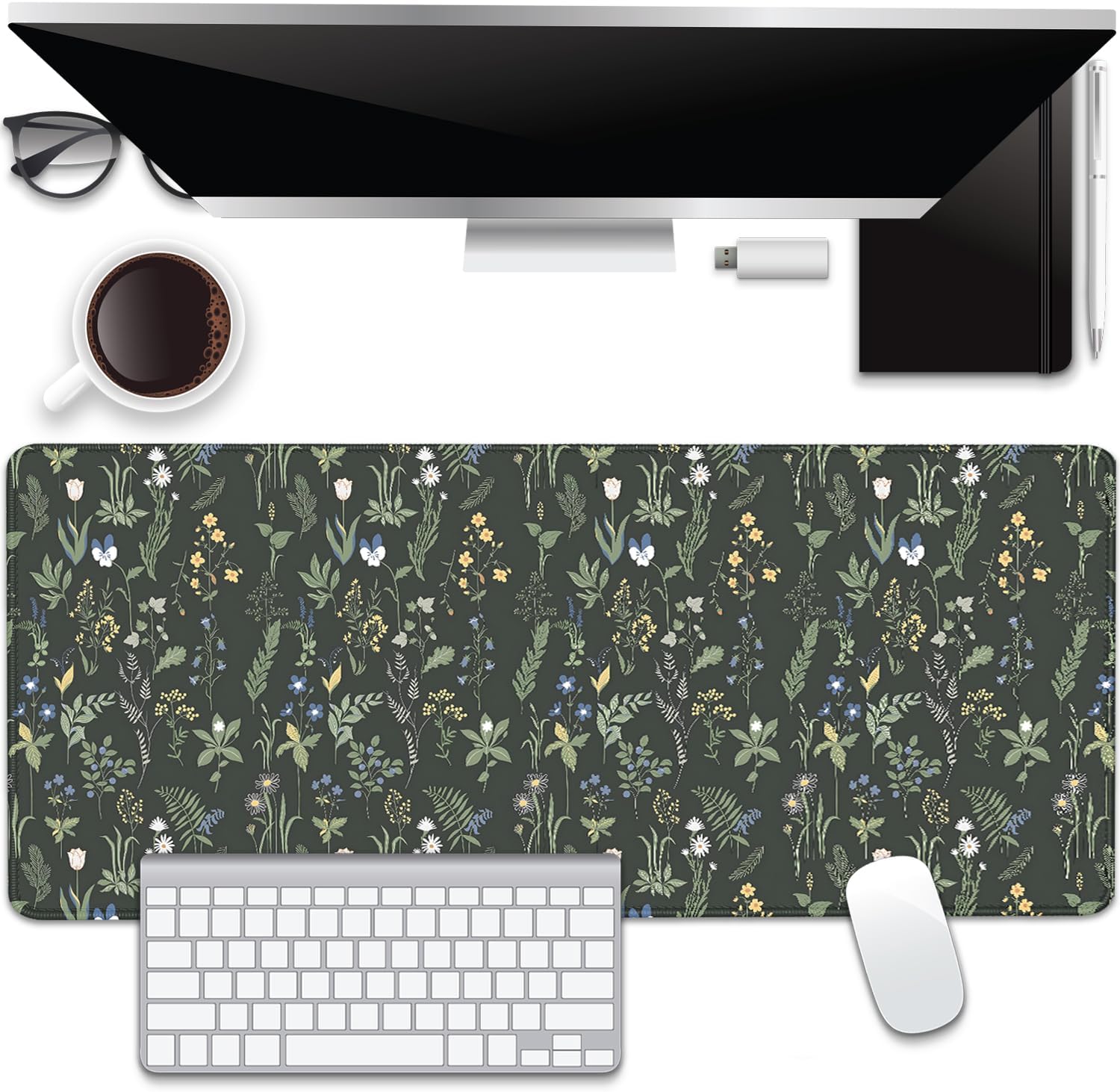 Green Plants Flowers Desk Pad Mouse Pad,Large Floral Mouse Mat with Stitched Edges,Non-Slip Rubber Base Elegant Mousepad for Office PC Keyboard Laptop and Home Work Desk Mat(27.5X11.8 in)