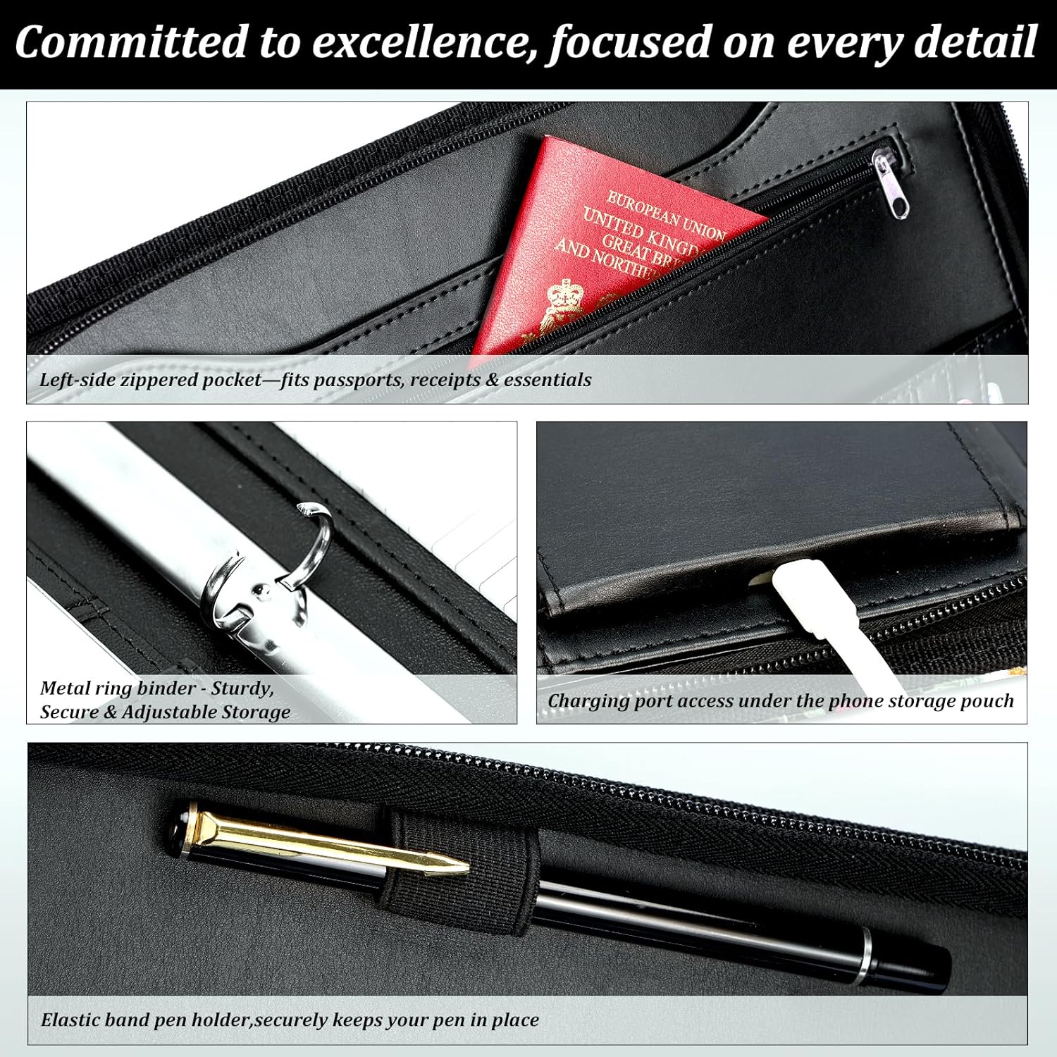 Leathario Portfolio Binder, Includes 5 Folder Index Dividers and 3 Notepads, 3-Ring Folder Organizer, Padfolio with Zipper, Vegan Leather Tablet Sleeve, Business Office Conference Clipboards