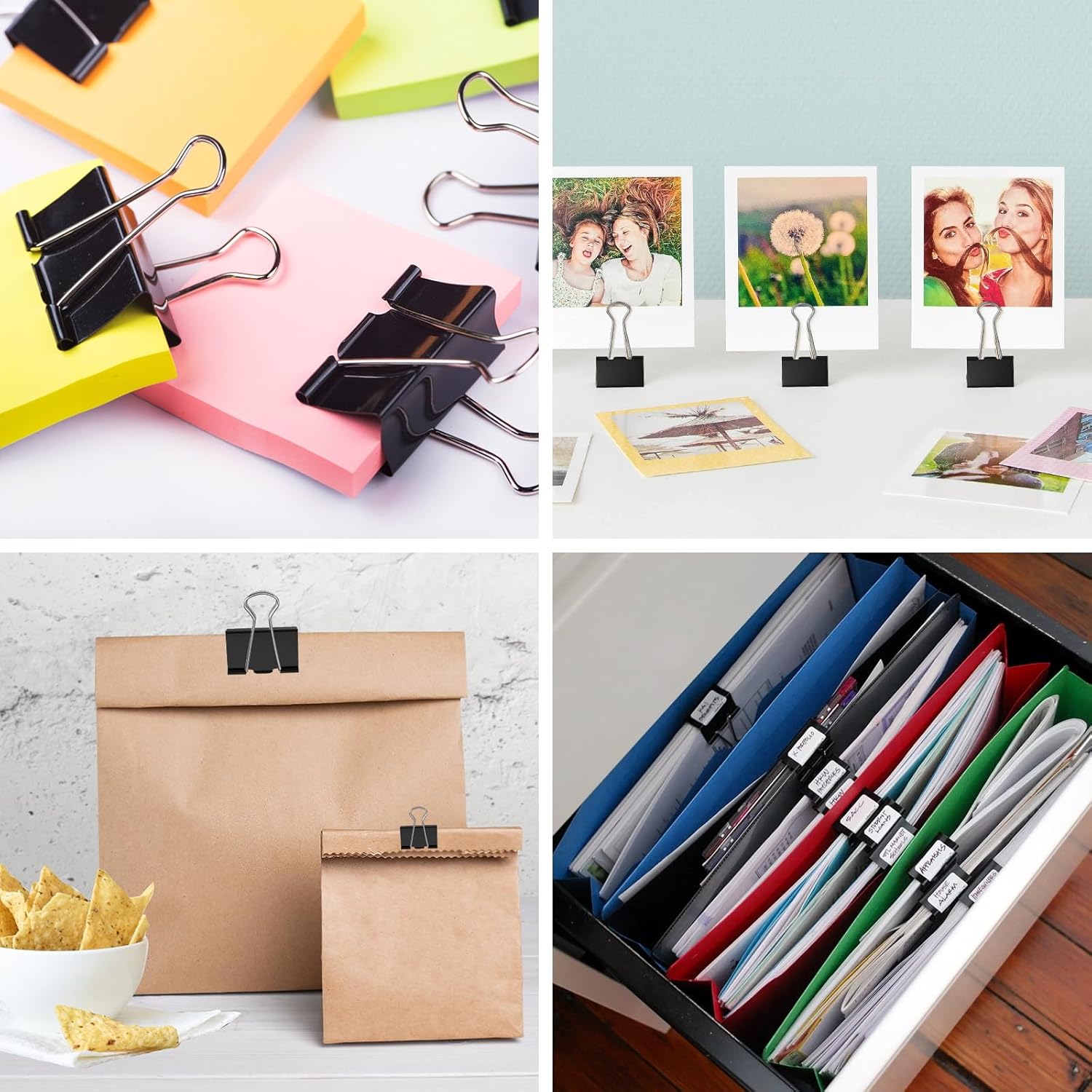 - Versatile Binder Clips Assorted Sizes: Perfect for food bags, clothes, or office files. Ideal for home, school, or work. These metal paper clamps handle any organizing challenge