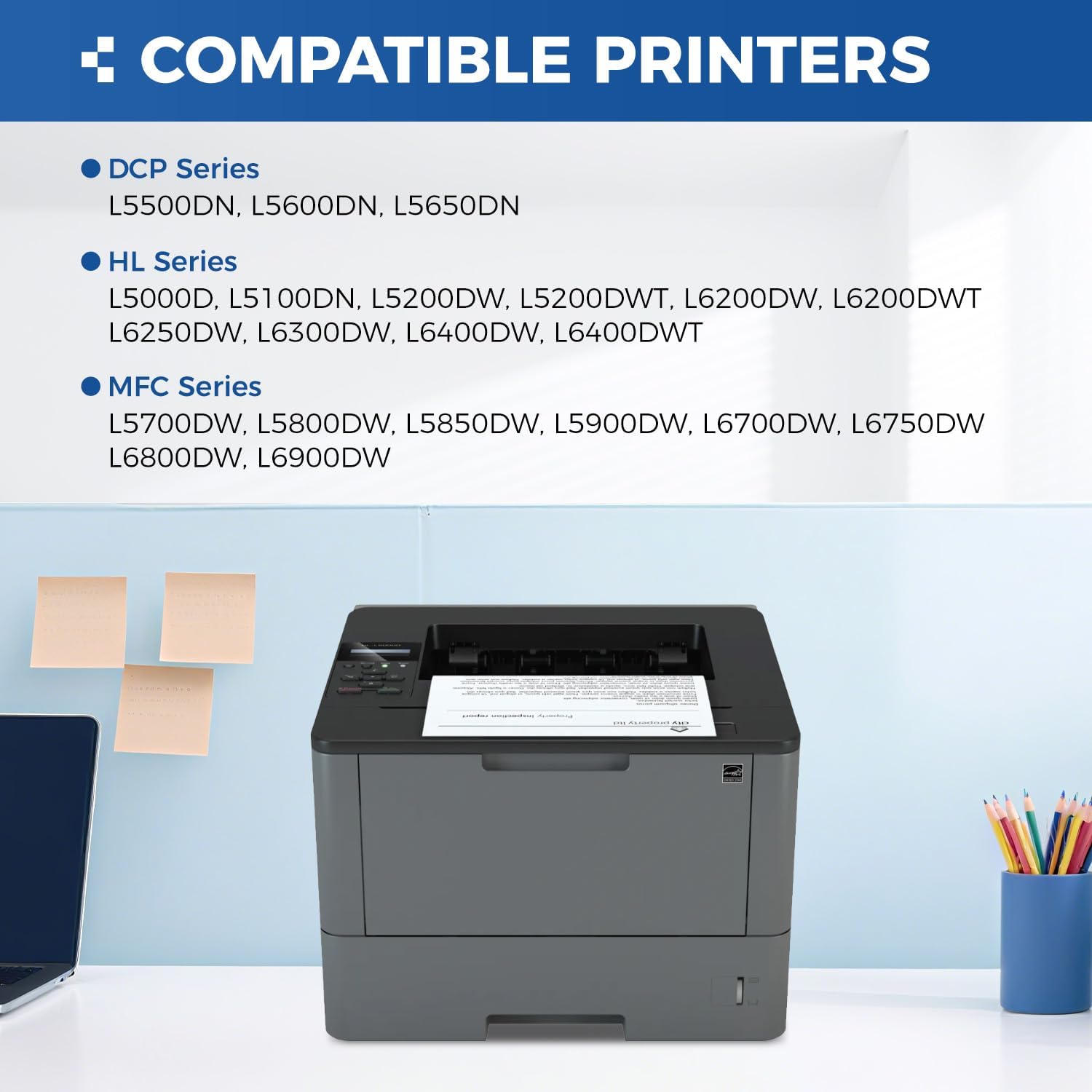 - Compatible Printer: Compatible with Brother DCP Printer Series: DCP-L5500DN, DCP-L5600DN, DCP-L5650DN, HL-L5000D, HL-L5100DN, HL-L5200DW, HL-L5200DWT, HL-L6200DW HL-L6200DWT, HL-L6250DW, HL-L6300DW, HL-L6400DW, HL-L6400DWT, MFC-L5700DW, MFC-L5800DW, MFC-L5850DW, MFC-L5900DW, MFC-L6700DW, MFC-L6750DW, MFC-L6800DW, MFC-L6900DW (Please check that your printer model matches the printer model of this toner cartridge before placing an order)