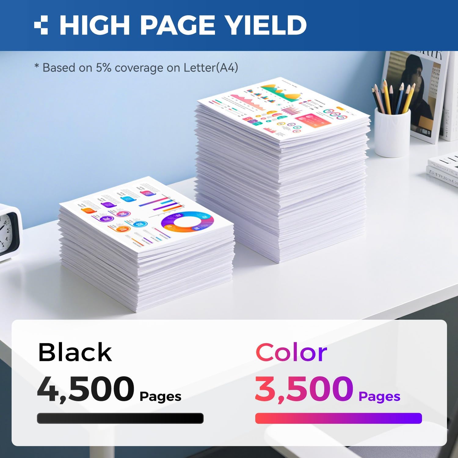 - High Yield Pages: 4,500 pages for Black and 3,500 pages Color toner cartridge (A4, 5% Coverage).