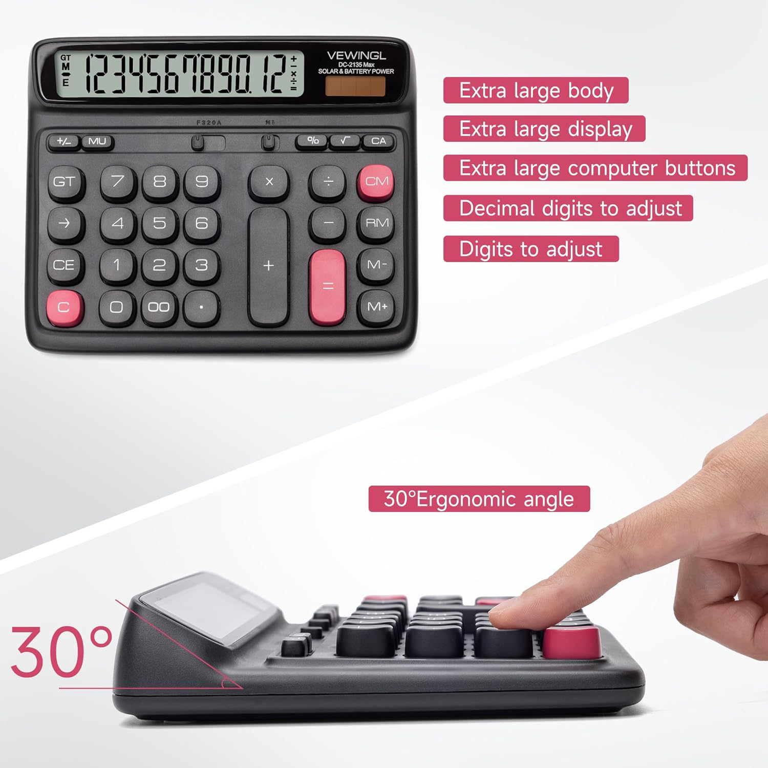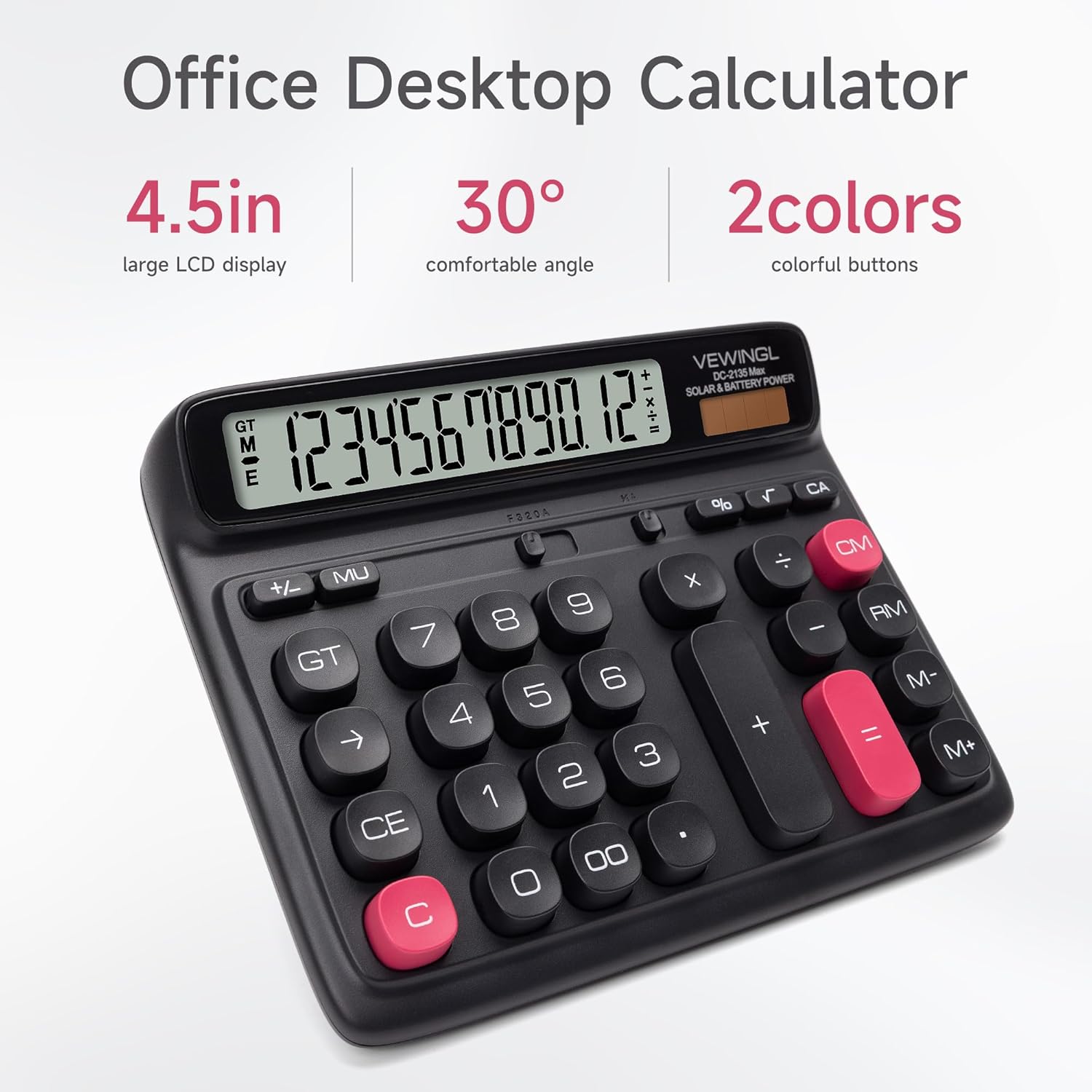 VEWINGL Desktop Calculator, 12-Digit Large LCD Display, Big Computer-Style Keys, Dual Power (Solar & Battery), Auto Sleep Mode, for Office, School, Home & Business 7.5″ x 6.1″ (Black, L)