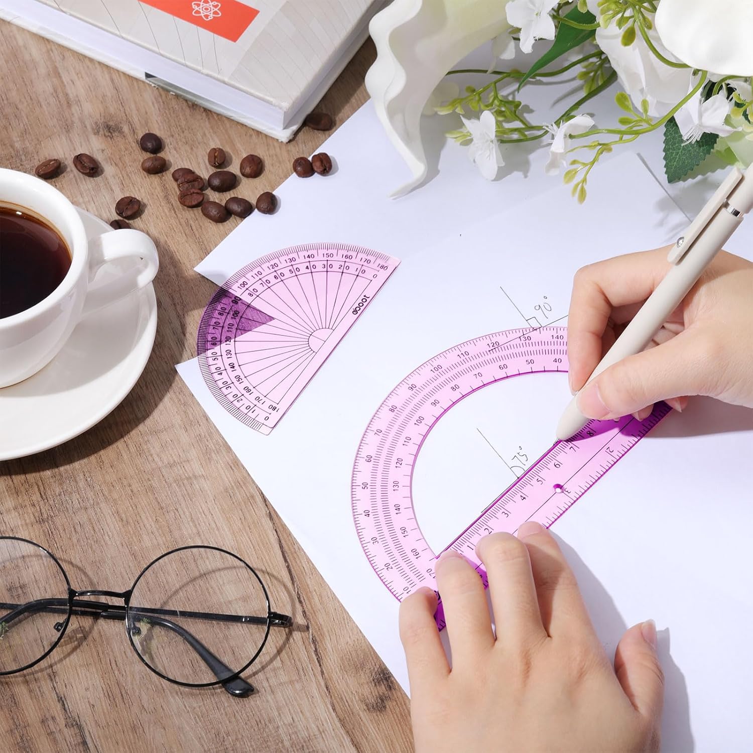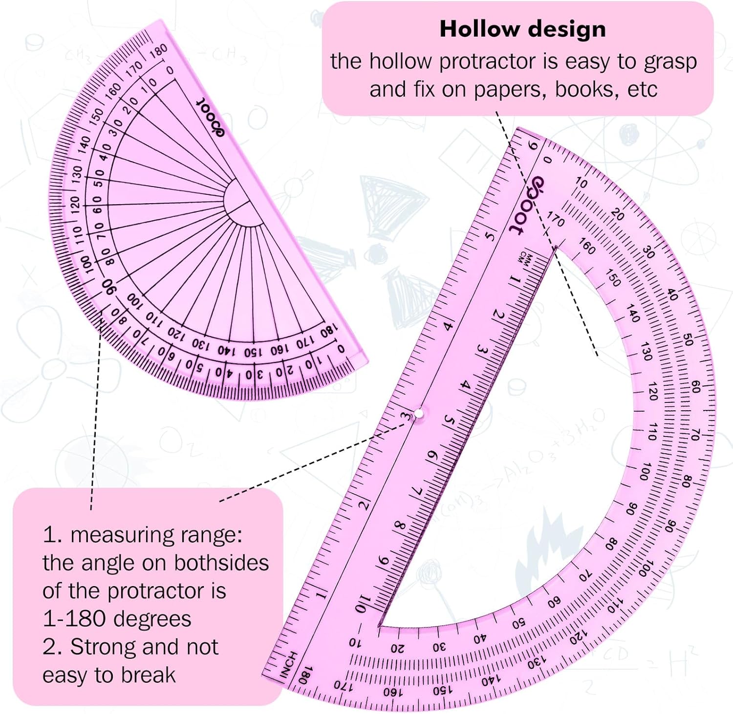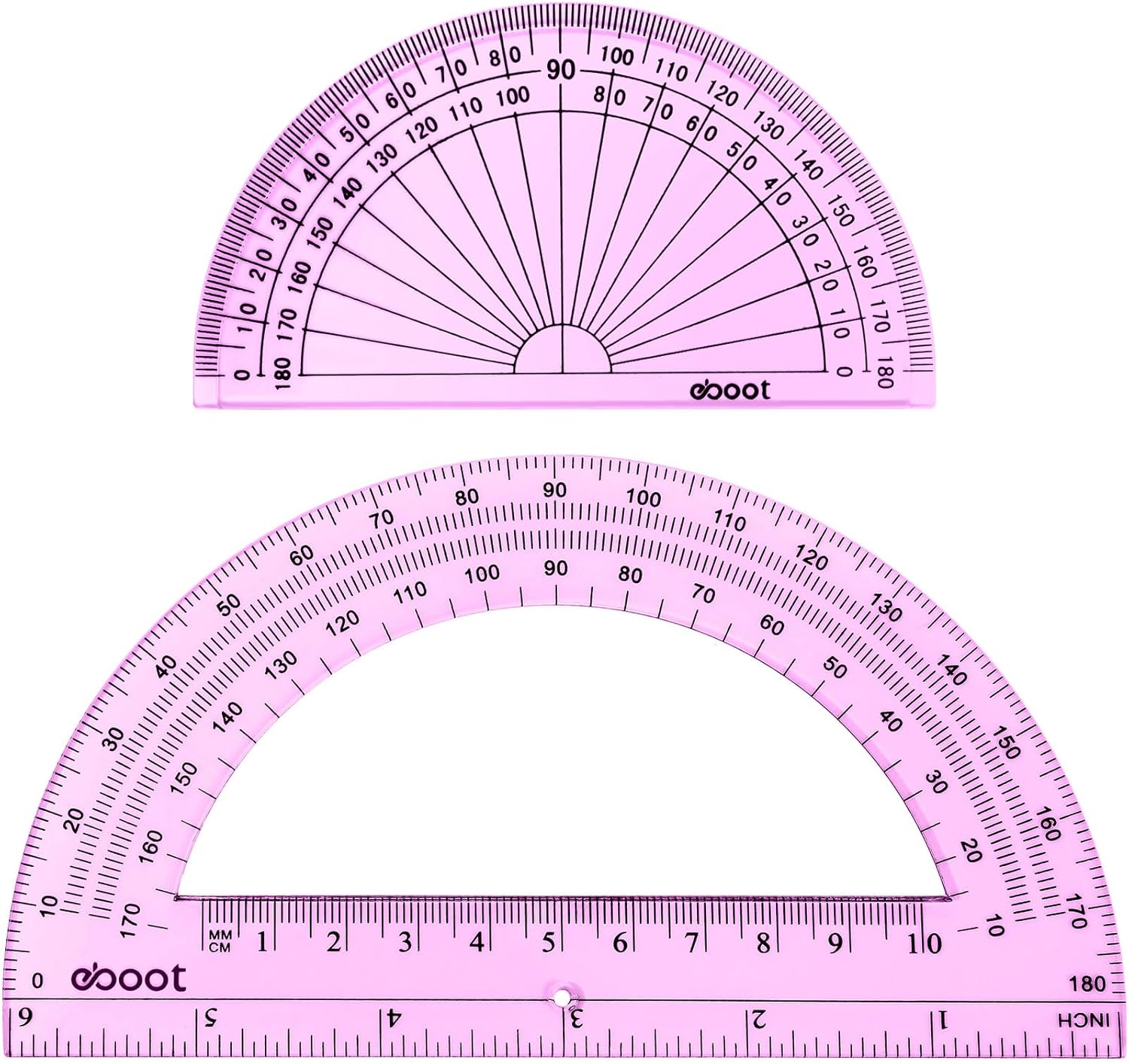 EBOOT 2 Pcs Plastic Protractor Clear 180 Degrees Transparent Protractor for Geometry, 4 Inch and 6 Inch(Pink)