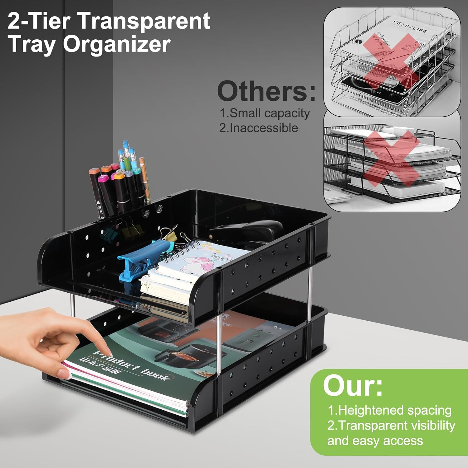 - Spacesaving Letter Tray Organizer: This letter tray organizer has open handles for easy access to your office supplies and files. It not only keeps your desk neat, organized and space-saving, but also helps you to solve the problem of cluttered desk and impossible to find files, thus improving your work efficiency