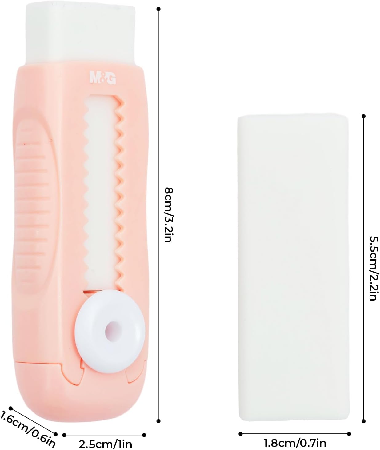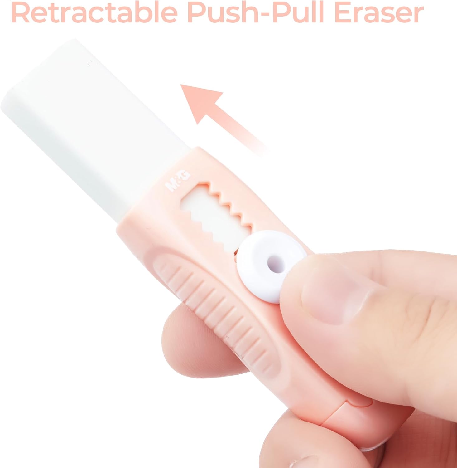 - 【PACKAGE INCLUDES】: The M&G set includes 4 push-pull retractable erasers, 2 with white erasers and light blue casings, and 2 with white erasers and light pink casings. Perfect for erasing pencil marks in various scenarios. Easily correct mistakes in your notes with a simple push.
