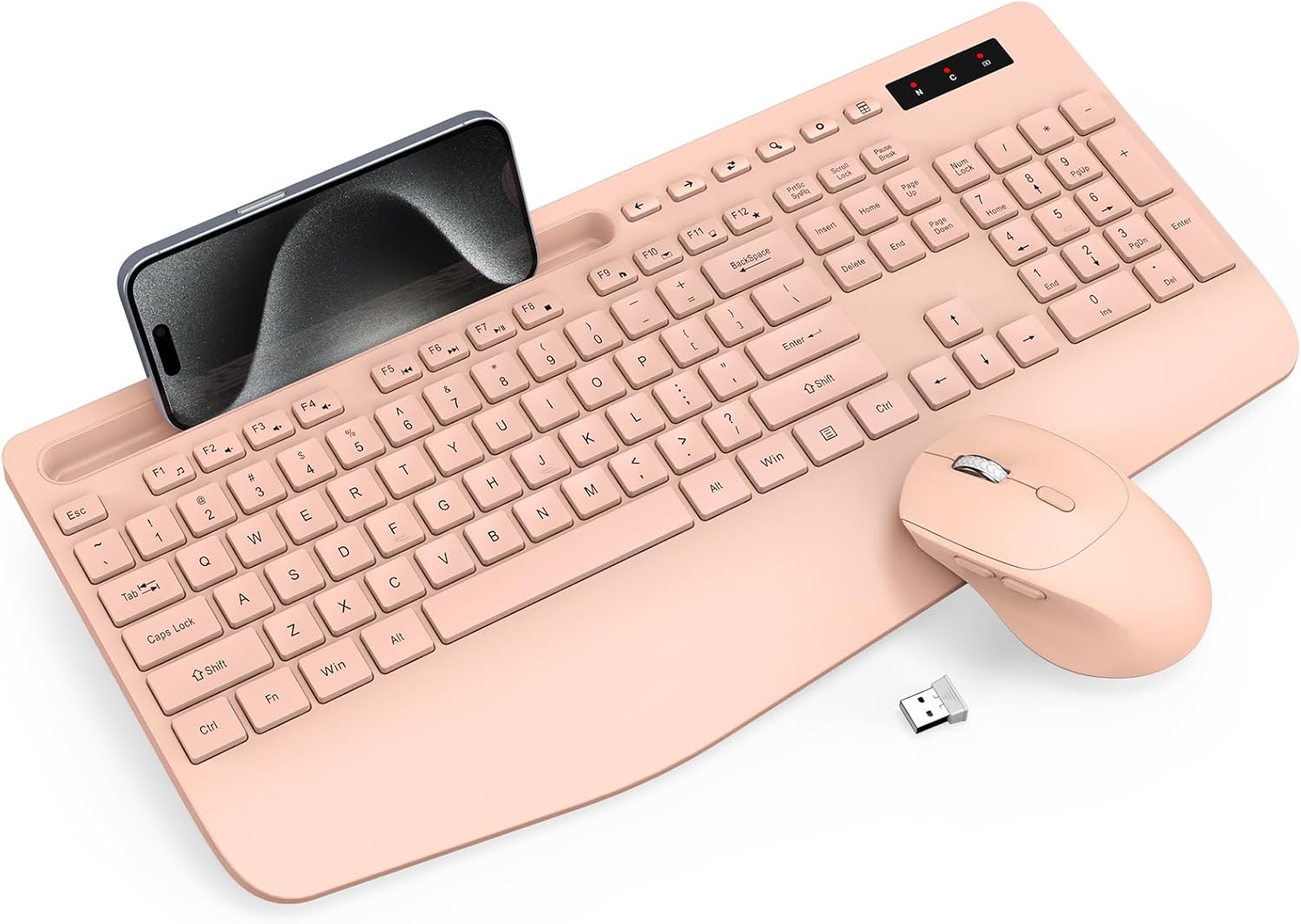 Trueque Wireless Keyboard and Mouse Combo - Full-Sized Ergonomic Keyboard with Wrist Rest, Phone Holder, Sleep Mode, Silent 2.4GHz Cordless Keyboards Mice Set for Computer, Laptop, PC, Windows (Pink)