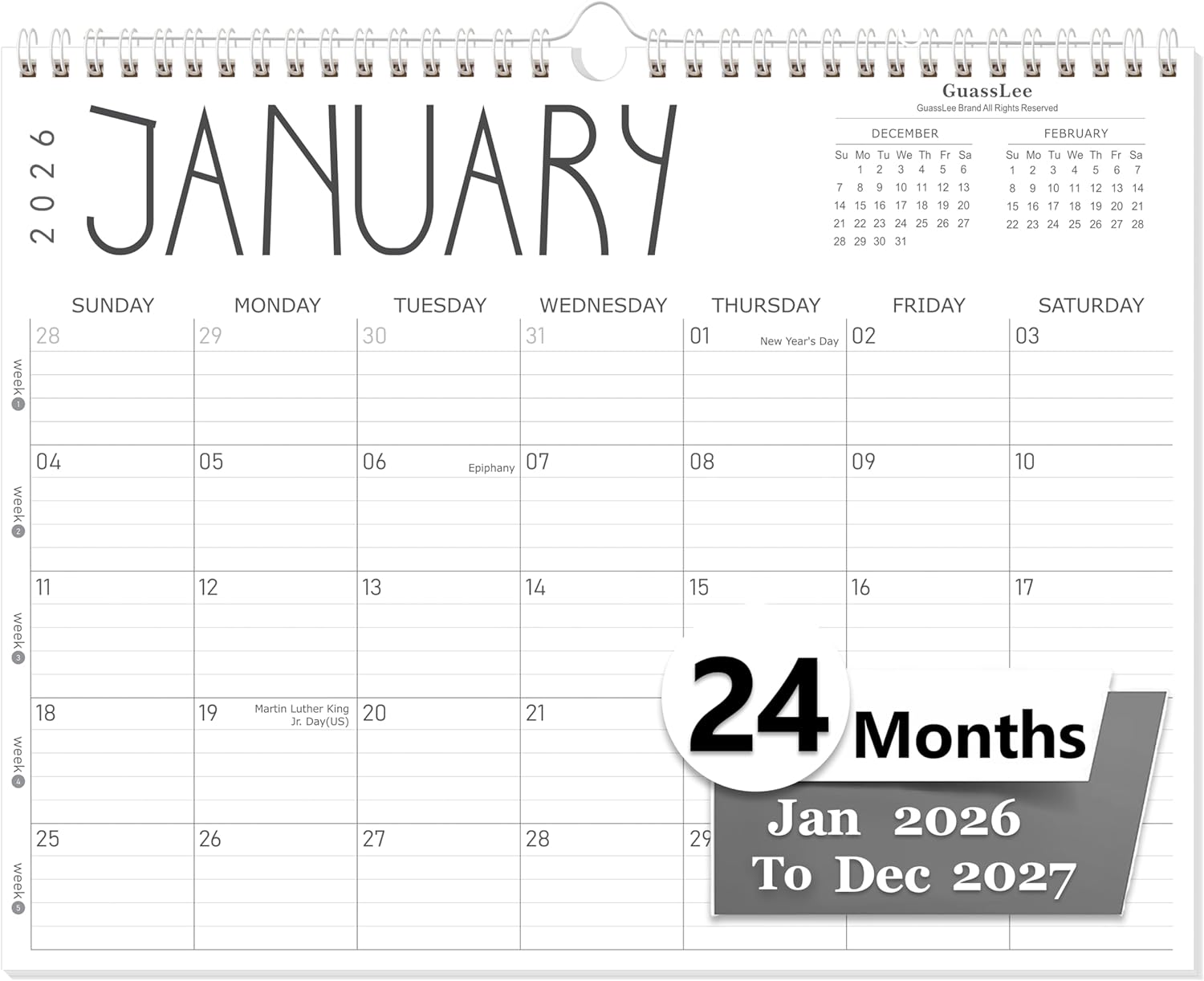 GuassLee Wall Calendar 2026-2027, 24-Month Wall Calendar Runs from January 2026 until December 2027,14" X 11" Hanging Monthly Planner with Thick Paper, Ruled Blocks for Home School Office Organizing