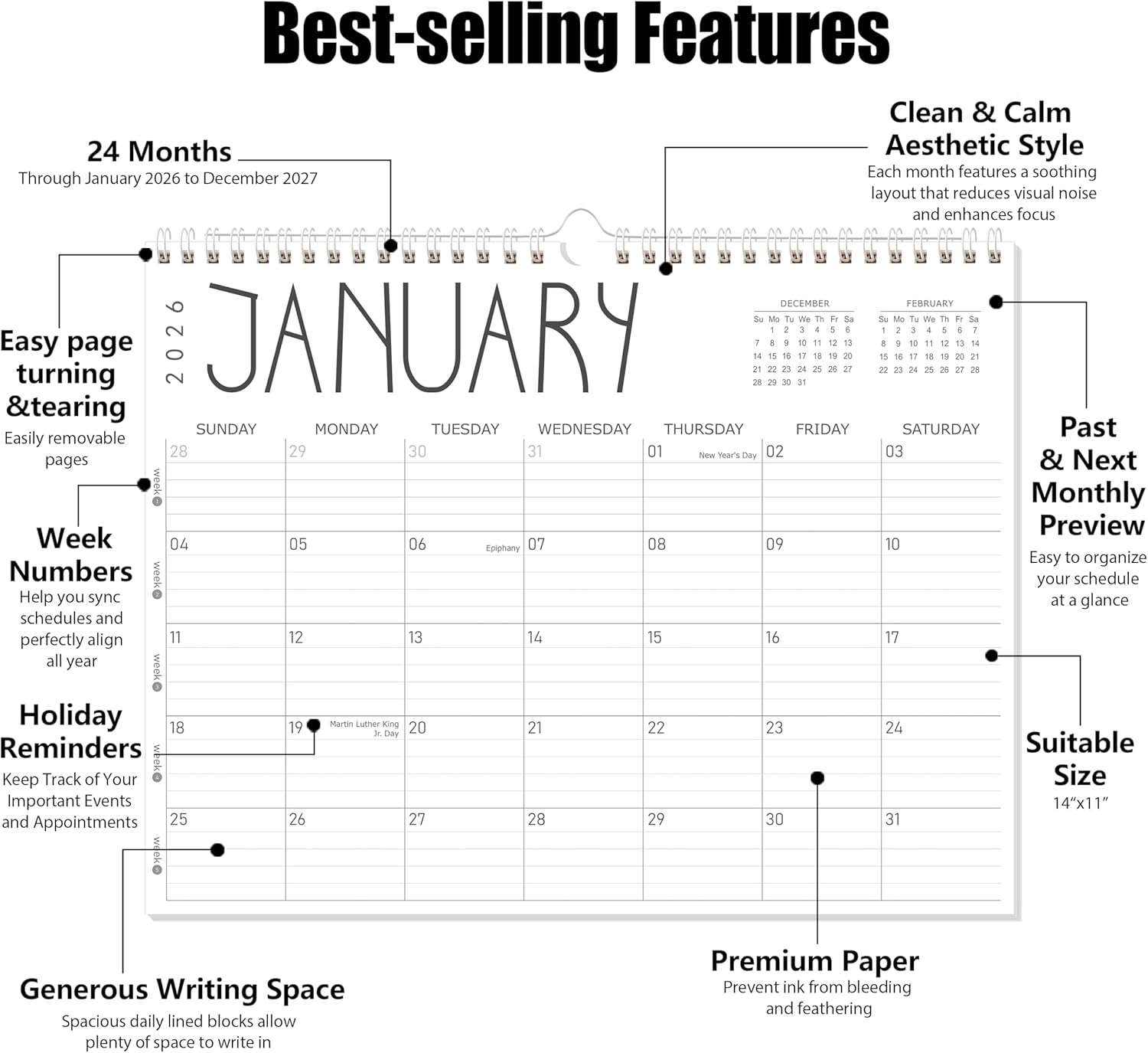 - Sleek Minimalist Design: Our 2026-2027 wall calendar features calming black tones, large daily blocks, highlighted holidays, and ample space for your to-do lists and notes. The minimalist design helps you stay focused, avoiding distracting colors. Whether you’re planning out the month or filling in the space with important details, we’re here to help inspire and motivate you as you tackle your tasks