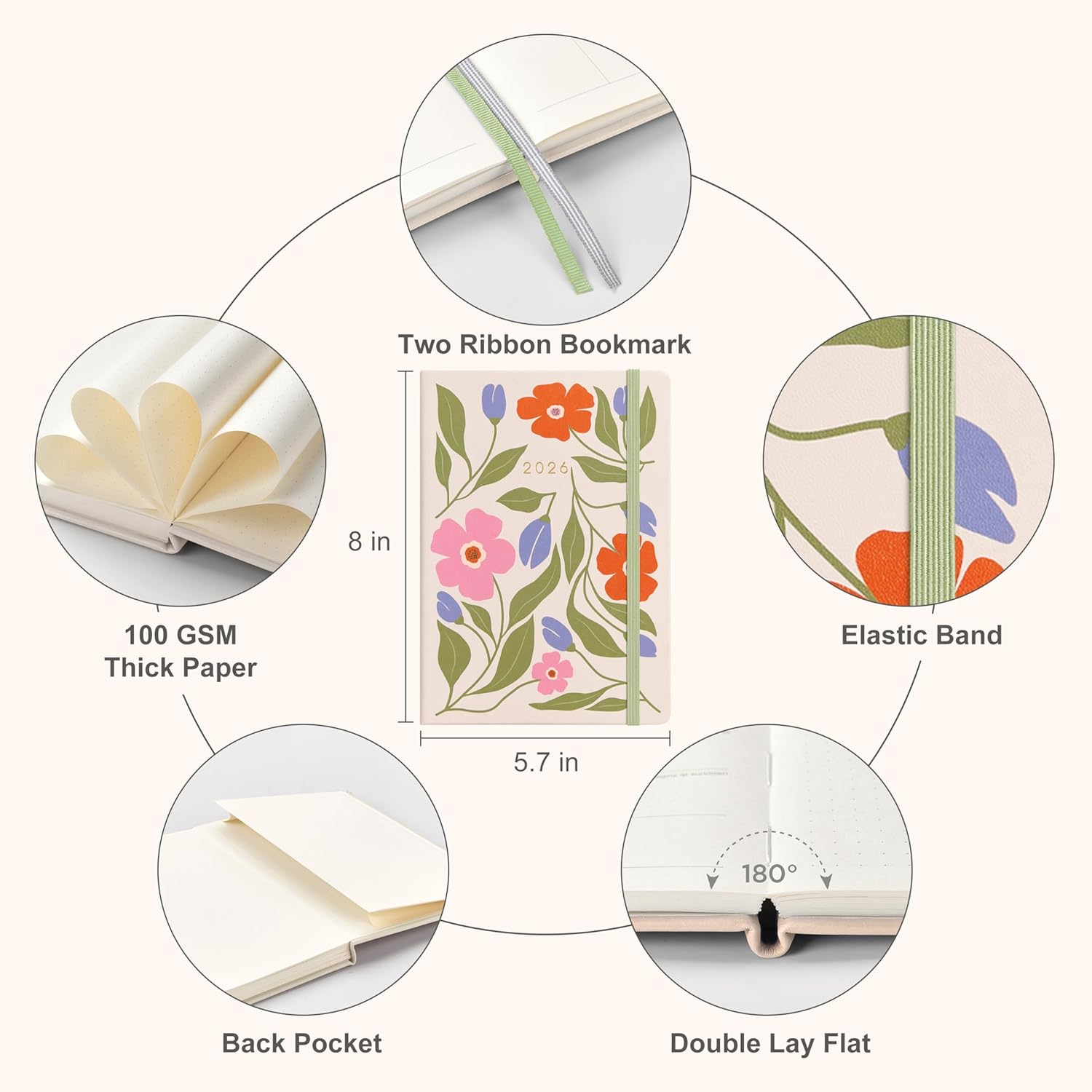 And Per Se 2026 Planner with Pattern-Daily, Weekly & 15-Monthly Leather Hardcover Planner, 5.7" x 8", Daily Schedule, Monthly Tabs, 100 GSM Thick Paper, Back Pocket(Botanical Floral)