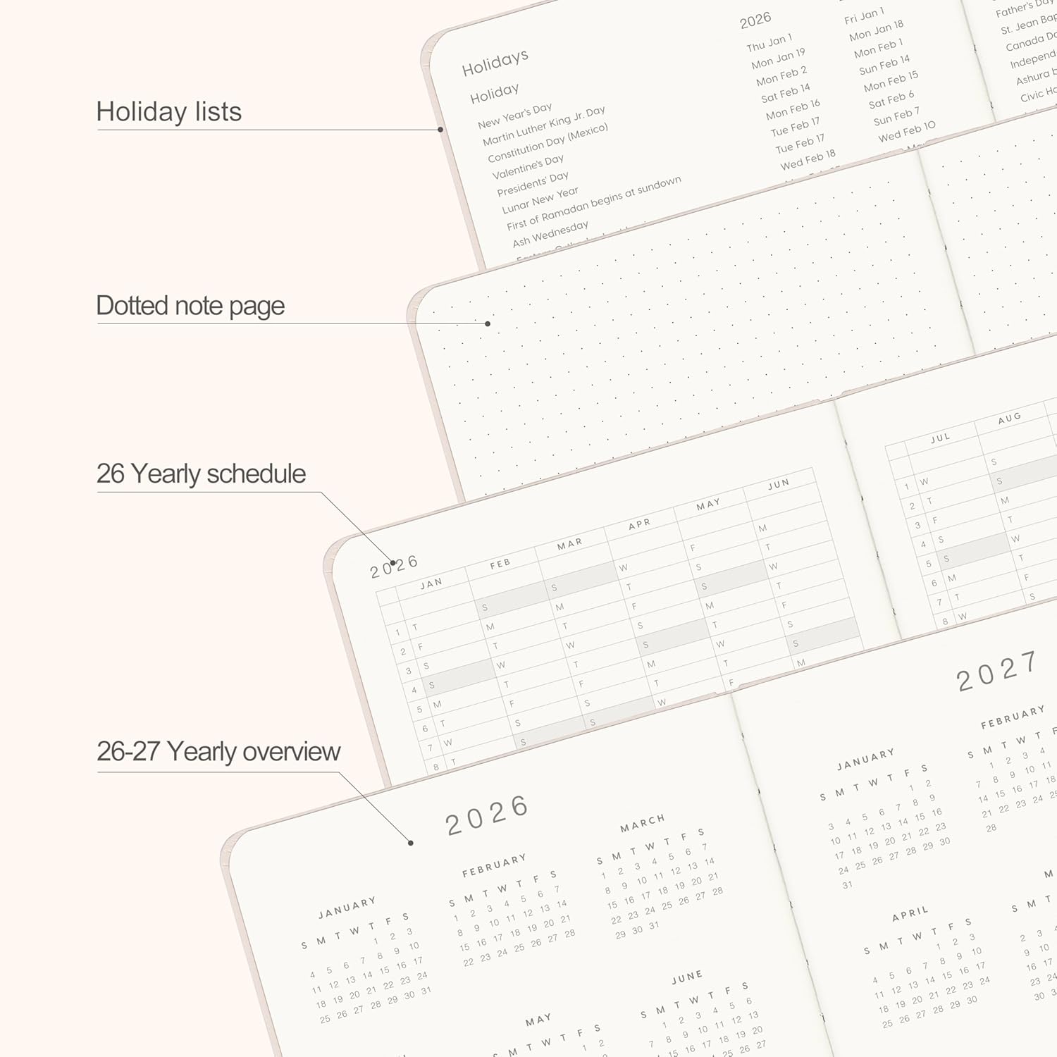 - MONTHLY OVERVIEW:Each date box provides enough writing space, including a display of holidays for each month, and the right notes row is additional planning space. 2 Ribbon bookmarks and month displays for easy navigation and lookup.